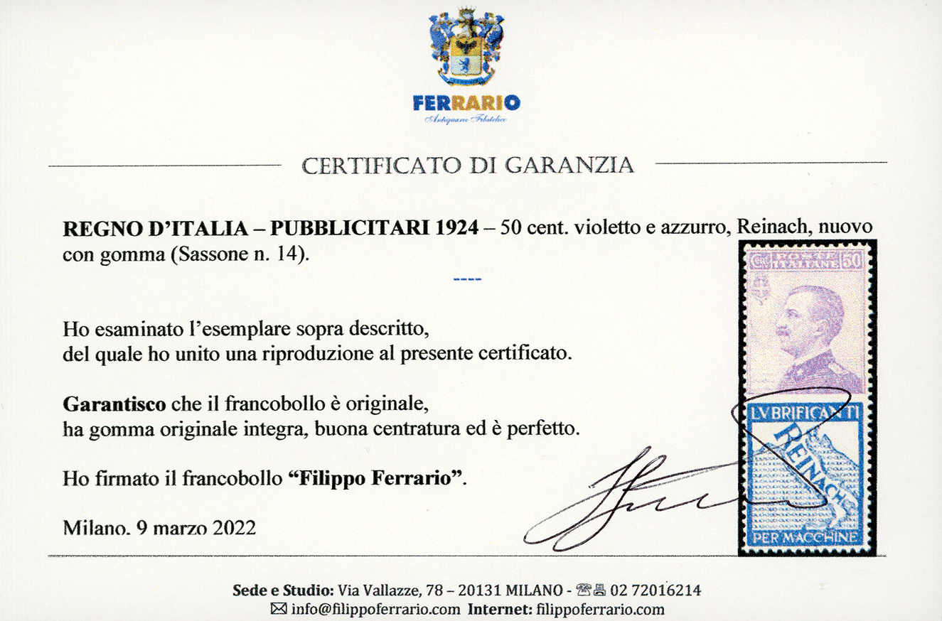 1924 - 50 cent. Reinach (14), nuovo, gomma originale integra, perfetto, molto fresco, buona centratura. Cert. Ferrario (cat.Sassone € 1.250/2.500).