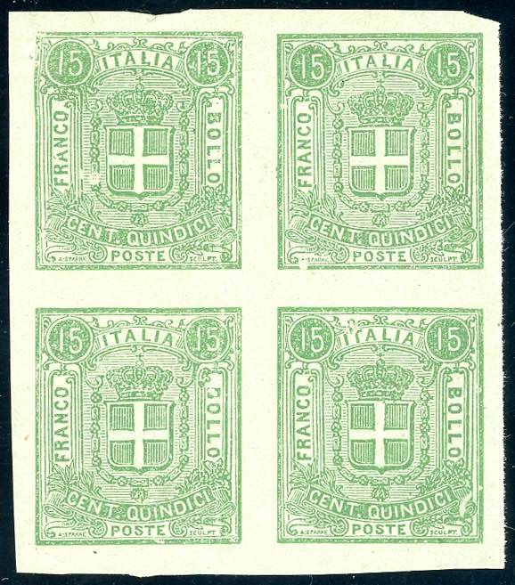 1862 - 15 cent. saggio Sparre, non dentellato, senza filigrana (Unificato 10A), blocco di quattro, gomma originale, integra per i due ... Read more