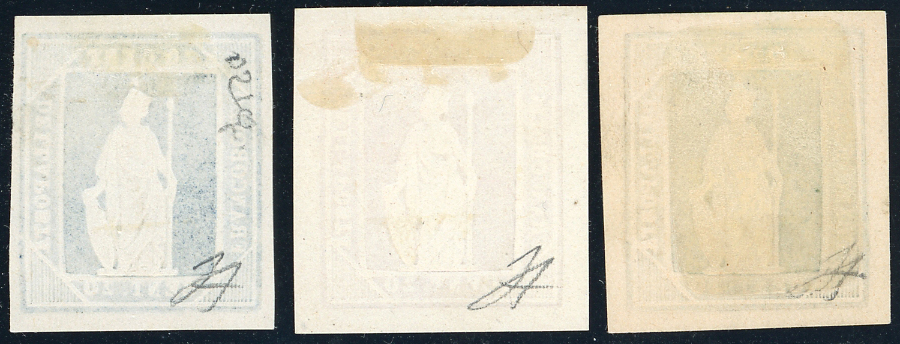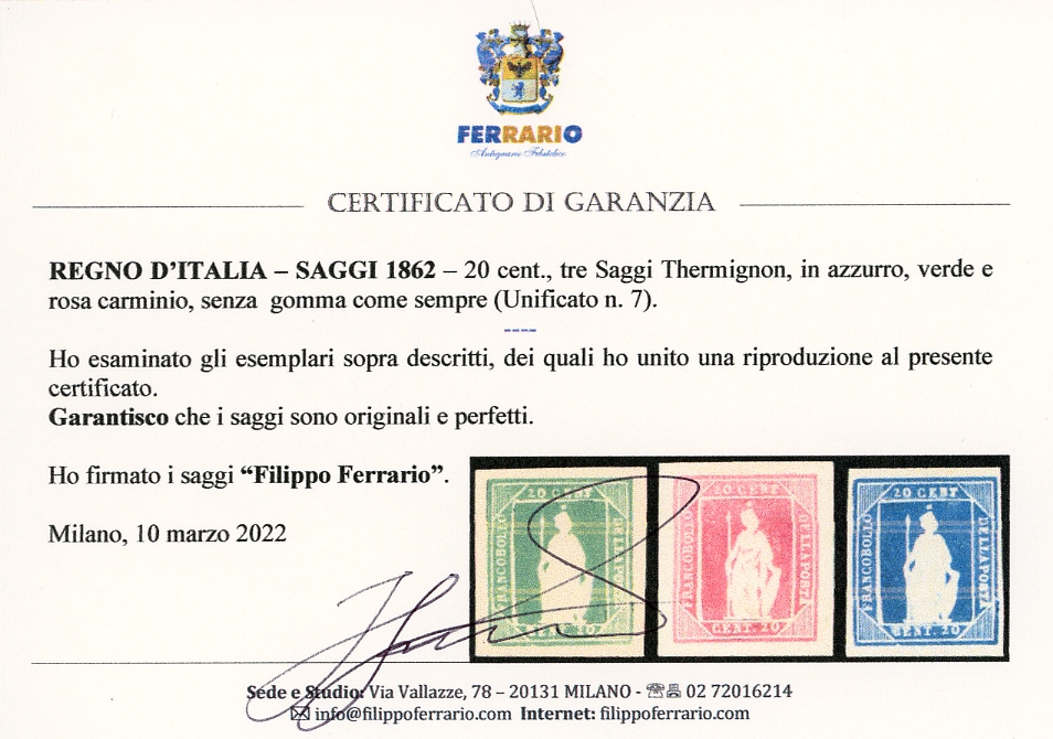 1862 - 20 cent. saggi Thermignon (Unificato 7), tre esemplari rispettivamente in azzurro, verde e rosa carminio, senza gomma come sempre, perfetti. Rari. Cert. Ferrario.
