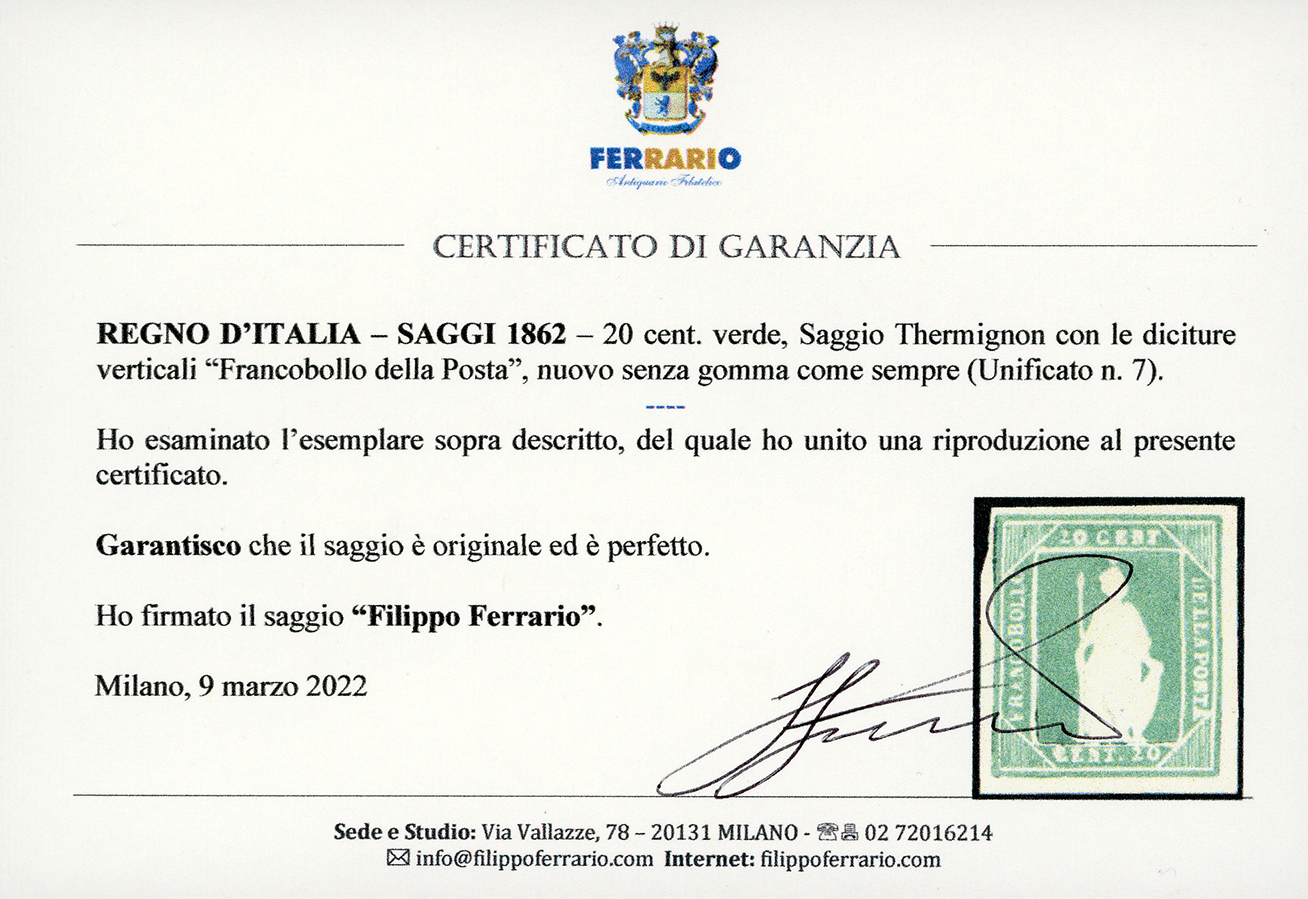 1862 - 20 cent. verde saggio Thermignon (Unificato 7), senza gomma come sempre, perfetto. Cert. Ferrario.