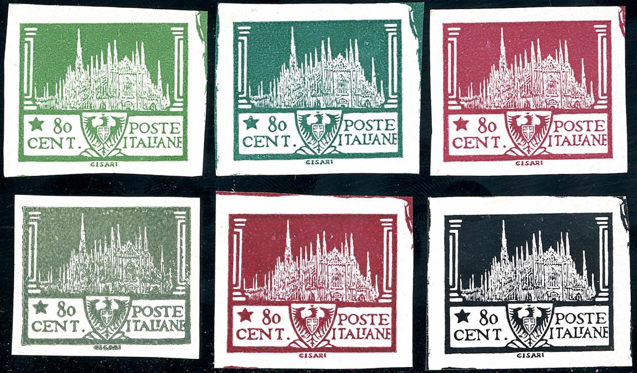 1919 - Sei prove di stampa per la serie "Artistica" disegnate da Cisari con soggetto il Duomo di Milano, tutte con valore da 80 cent., in colori differenti. Non comuni. Ferrario.