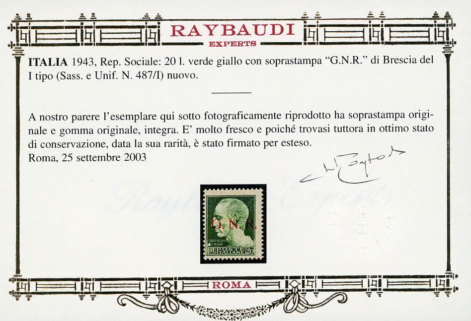 1943 - 20 lire soprastampato G.N.R., I tipo, tiratura di Brescia (487/I), gomma originale integra, perfetto. Raro, tiratura cento esemplari. Cert. Oro Raybaudi e Ferrario.