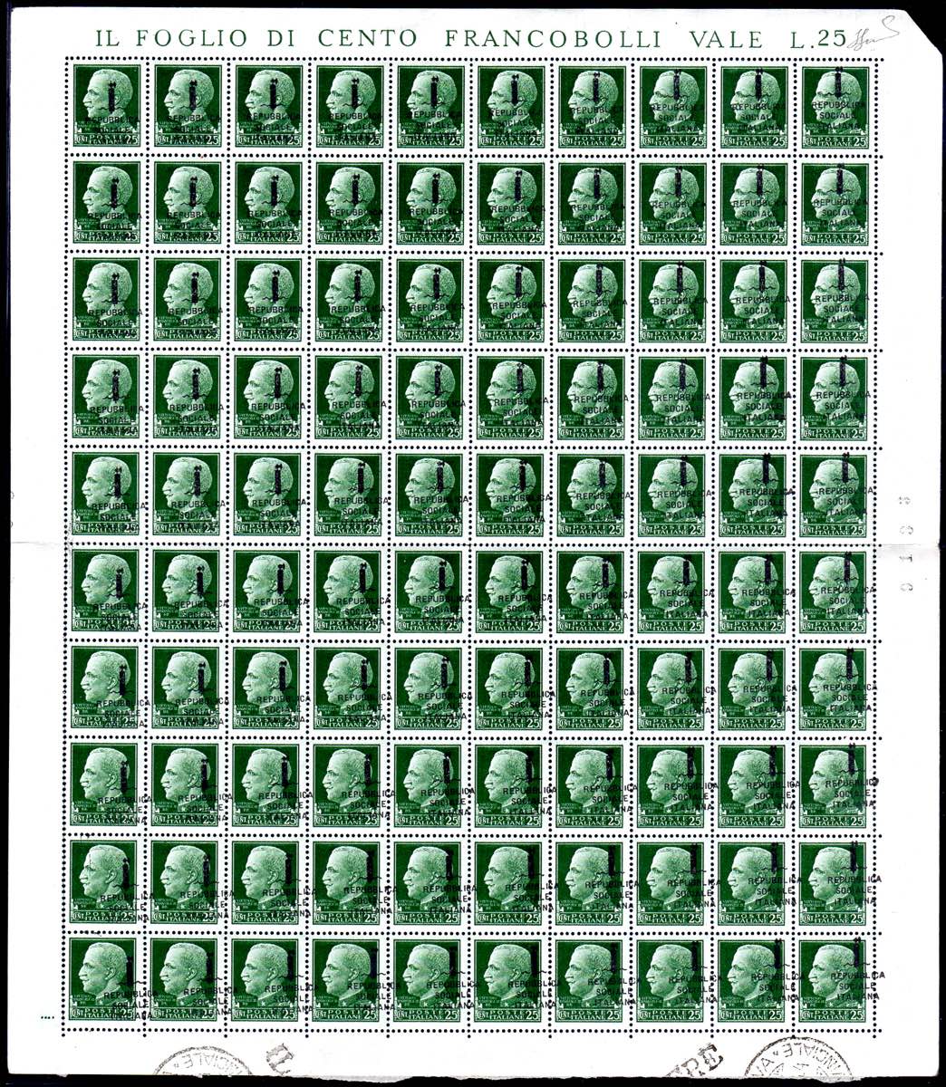1944 - 25 cent. soprastampato fascetto, foglio completo di 100 esemplari con soprastampa obliqua (491h), gomma integra, perfetto. Non comune. Ferrario.