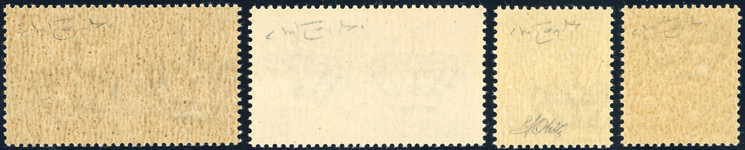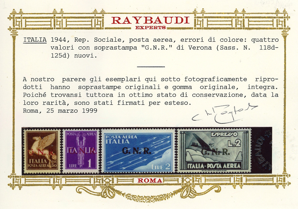 1944 - Soprastampati G.N.R., tiratura di Verona, errore di colore della soprastampa, quattro valori (118A/125A), gomma originale integra, perfetti. Cert. Oro Raybaudi.