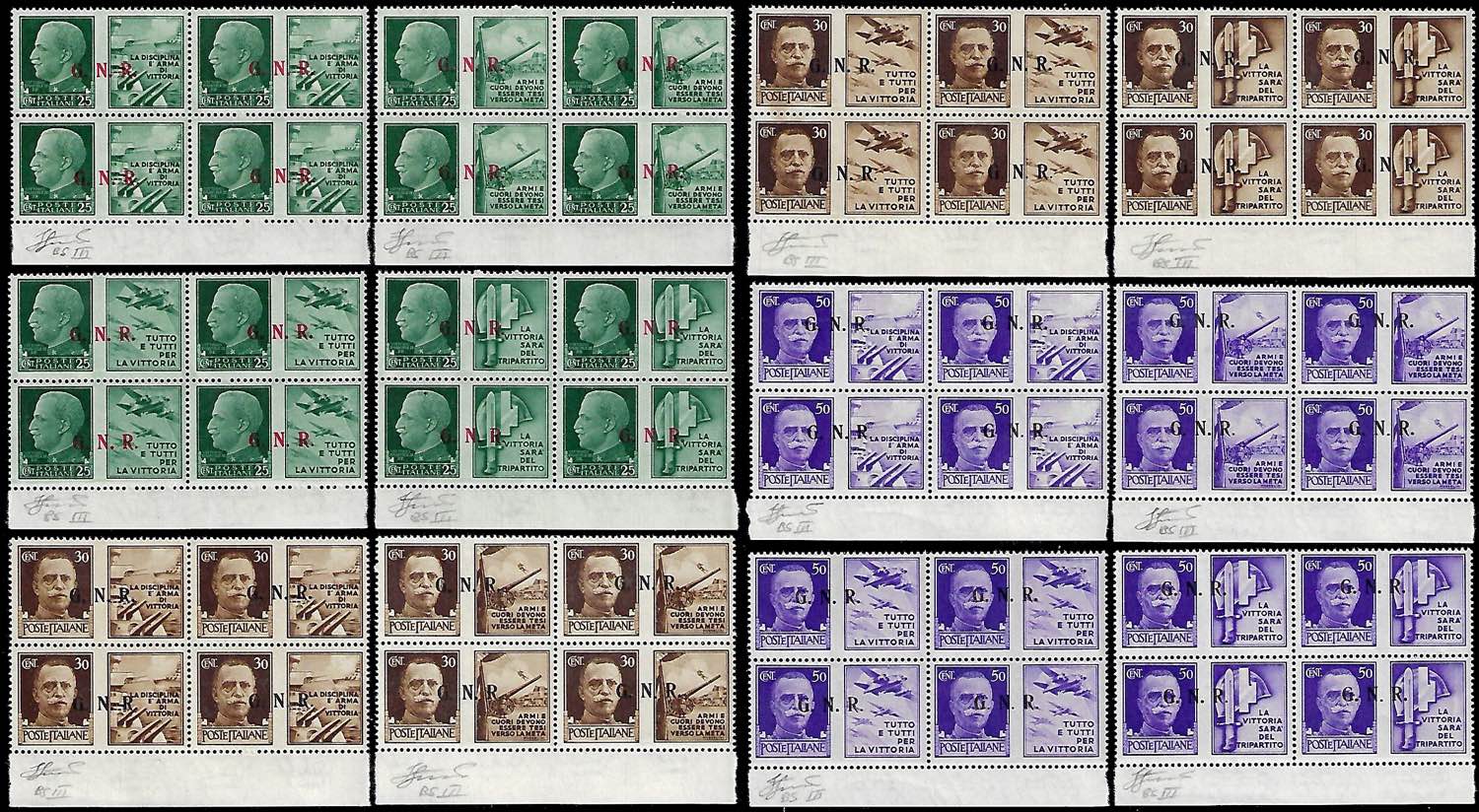 1943 - Serie completa in blocchi di quattro, bordo di foglio, soprastampati G.N.R. III tipo, tiratura di Brescia (13/III-24/III), nuovi, ... Read more