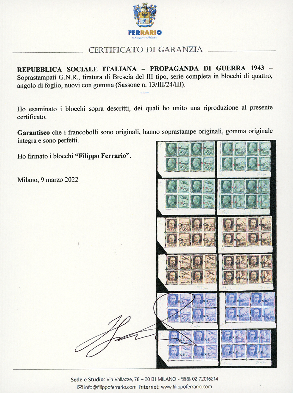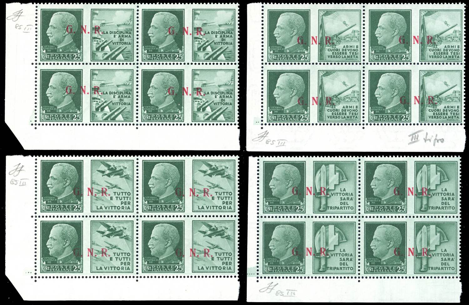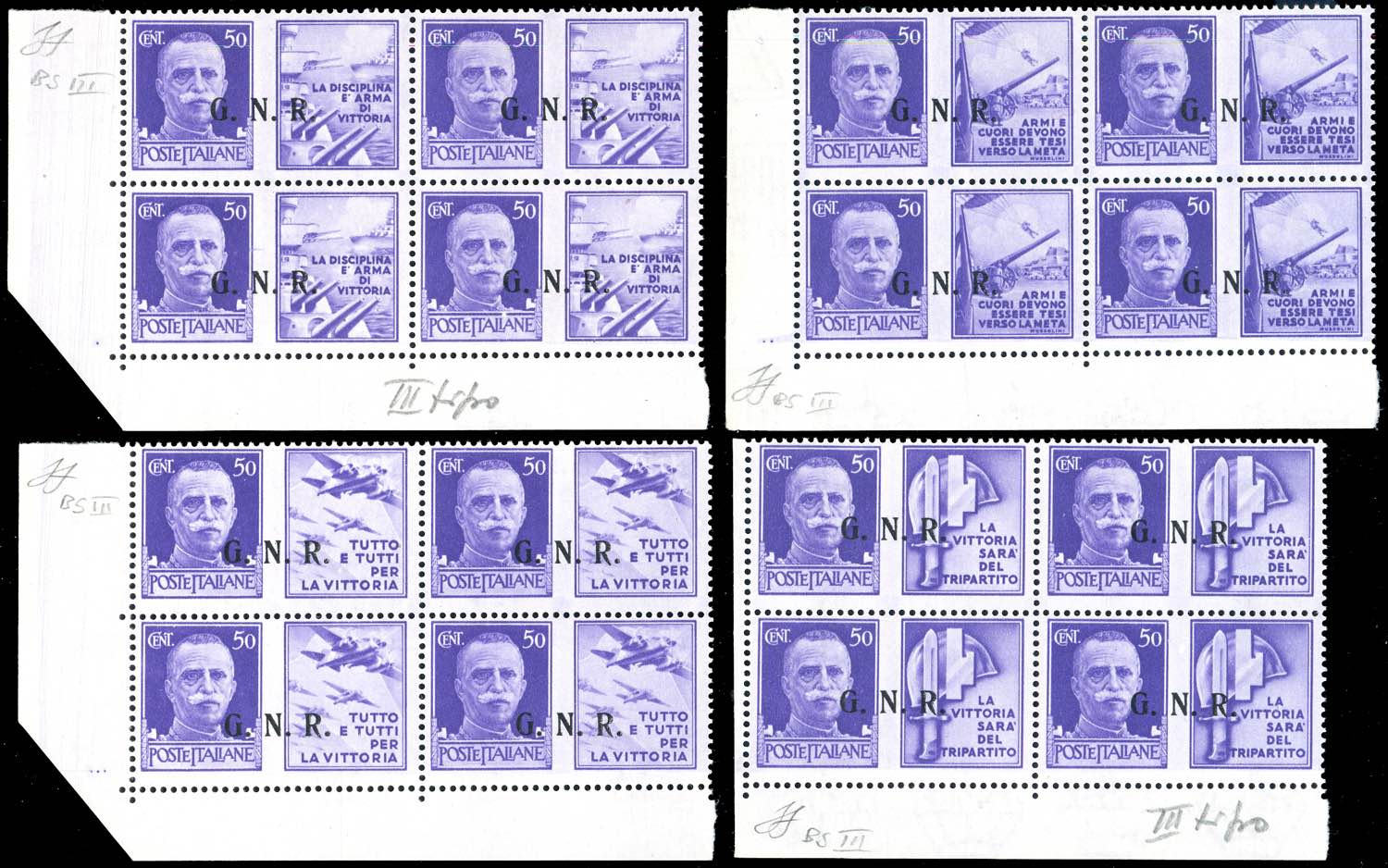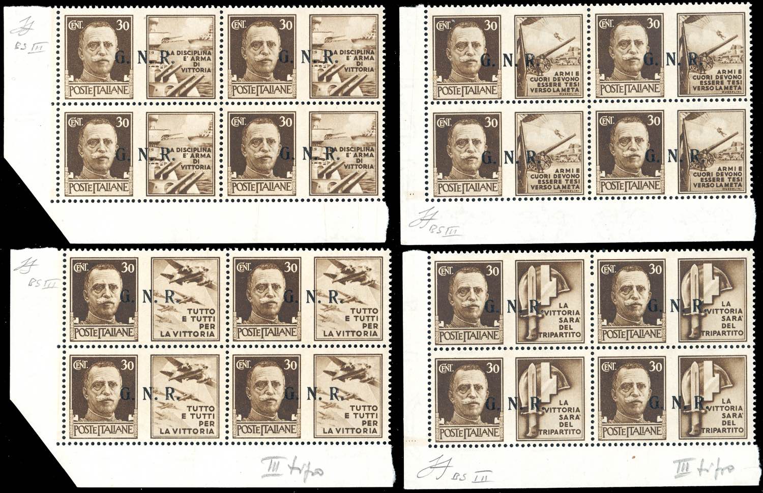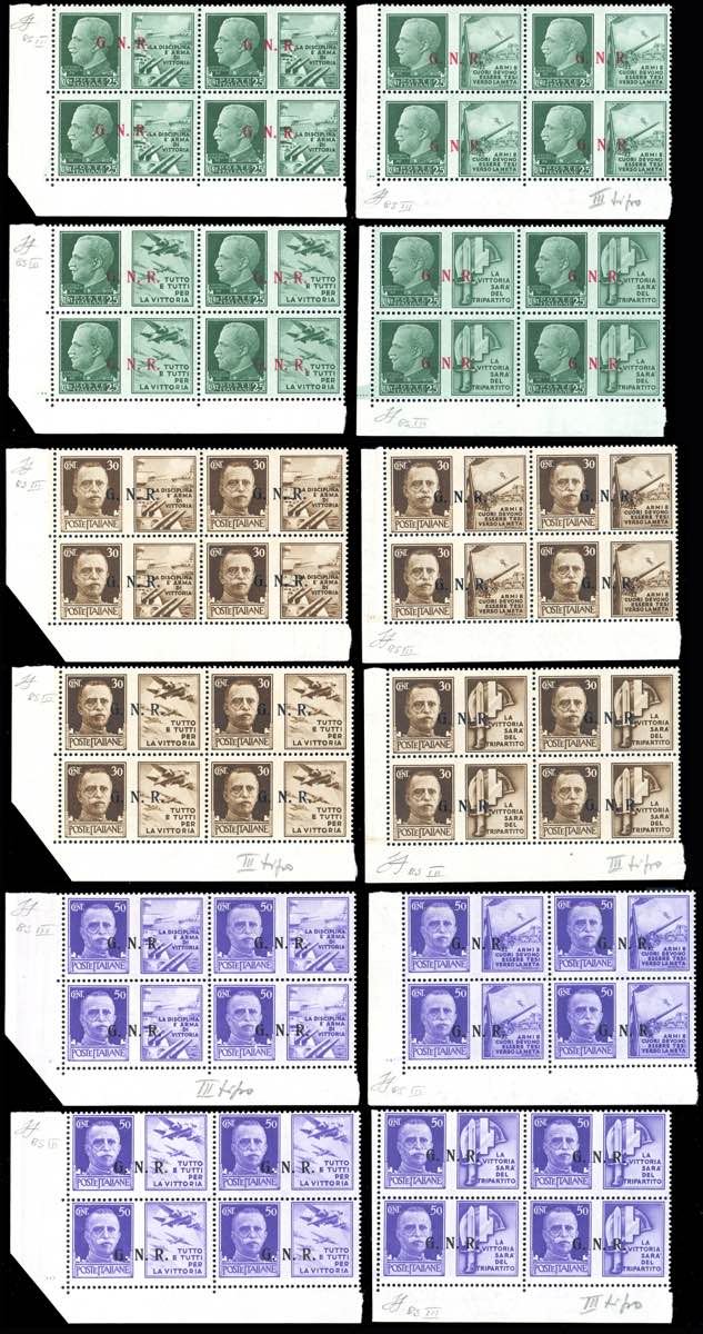1943 - Soprastampati G.N.R., tiratura di Brescia, III tipo, serie completa (13/III-24/III), blocchi di quattro, angolo di foglio, gomma integra, perfetti. Molto belli. Cert. Ferrario.