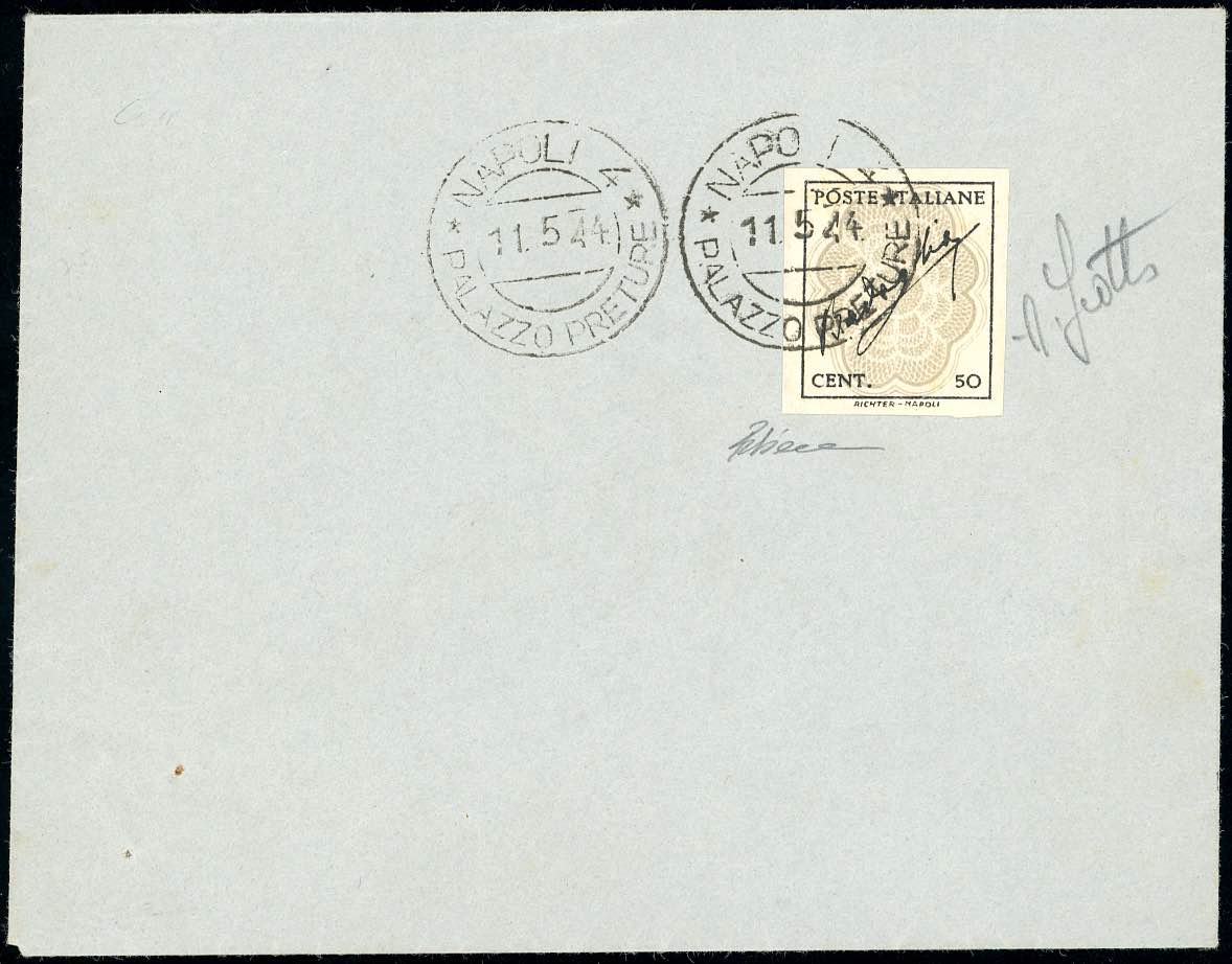 1944 - 50 cent. nero su grigio Badoglio, non dentellato (515Cb), perfetto, usato su busta non viaggiata "Napoli 11/5/1944". Raro. Cert. ... Read more