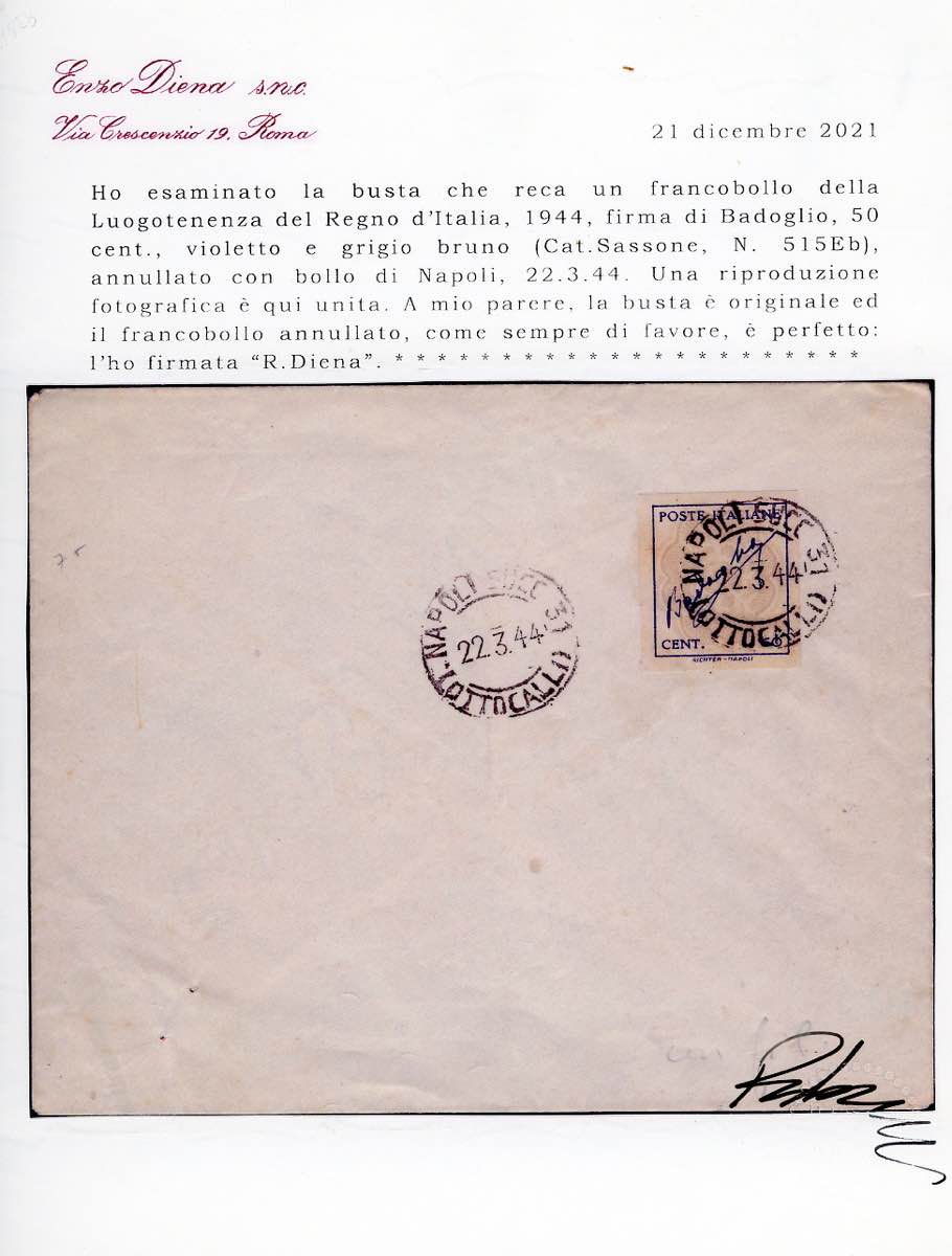 1944 - 50 cent. violetto e grigio bruno Badoglio, non dentellato (515Eb), perfetto, usato su busta viaggiata a "Napoli 22/3/1944". Raro. Cert. Diena.