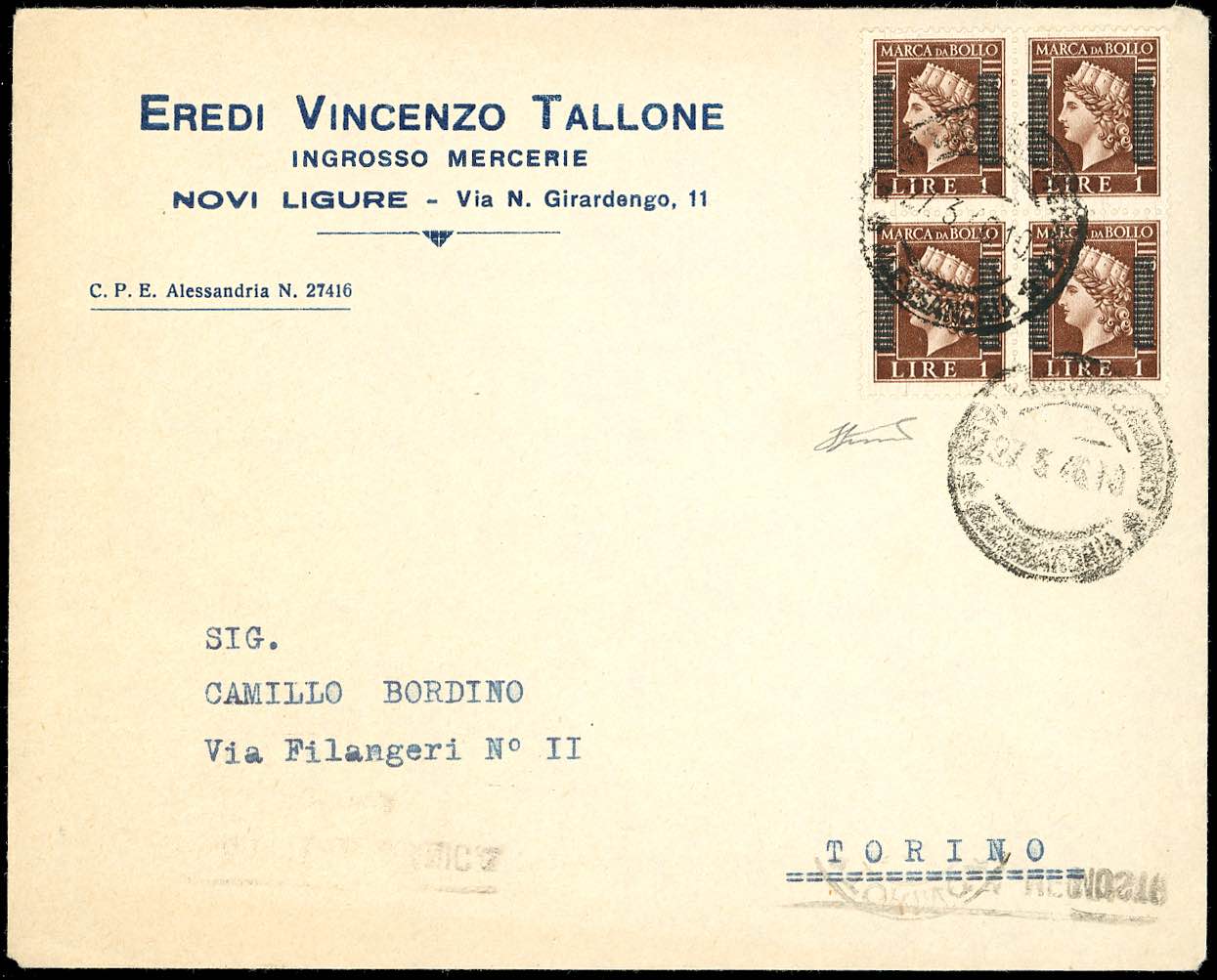 1946 - 1 lira fascetti soprastampati, marca da bollo, blocco di quattro, perfetto, su busta da Novi Ligure 27/3/1946 ad Alessandria. Rara affrancatura d'emergenza. Ferrario.