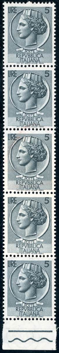 1953 - 5 lire Siracusana, filigrana ruota, striscia verticale di cinque, due esemplari stampati su carta ricongiunta (710c), gomma integra, perfetta. Ferrario.