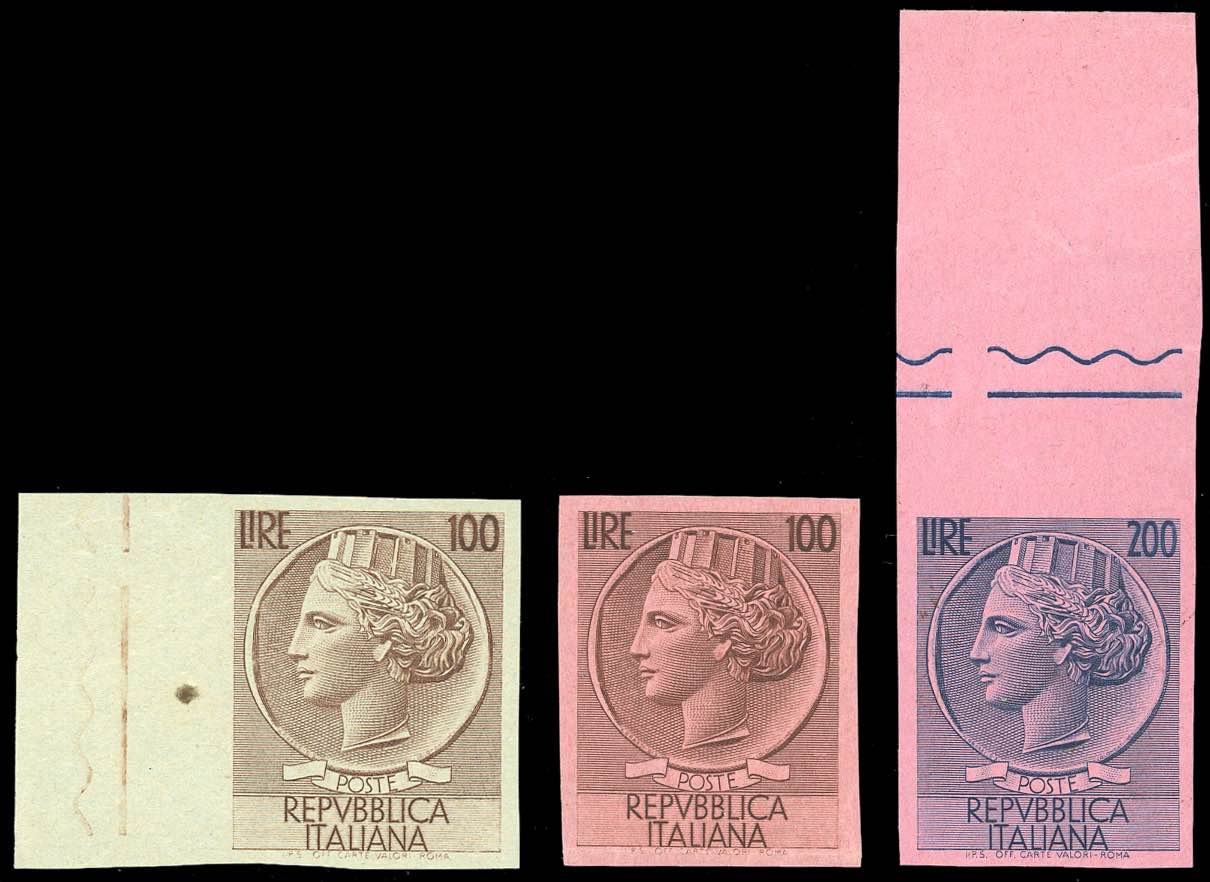 1954 - 100 e 200 lire Turrita (747/748), tre prove di stampa, su carta grigia per il primo e su carta rosa per entrambi, non dentellate, nuove senza gomma come sempre, perfette. Non comuni. Ex coll. Faberius.