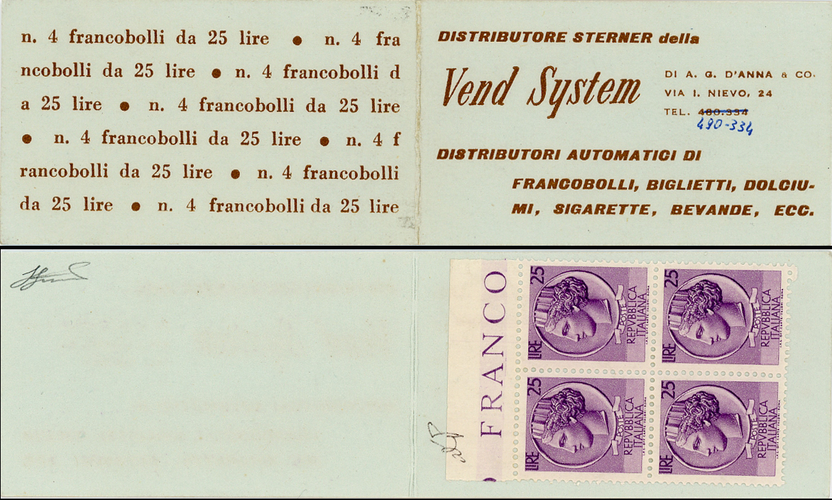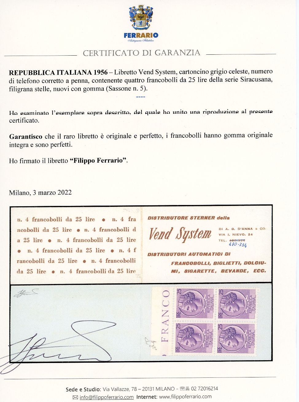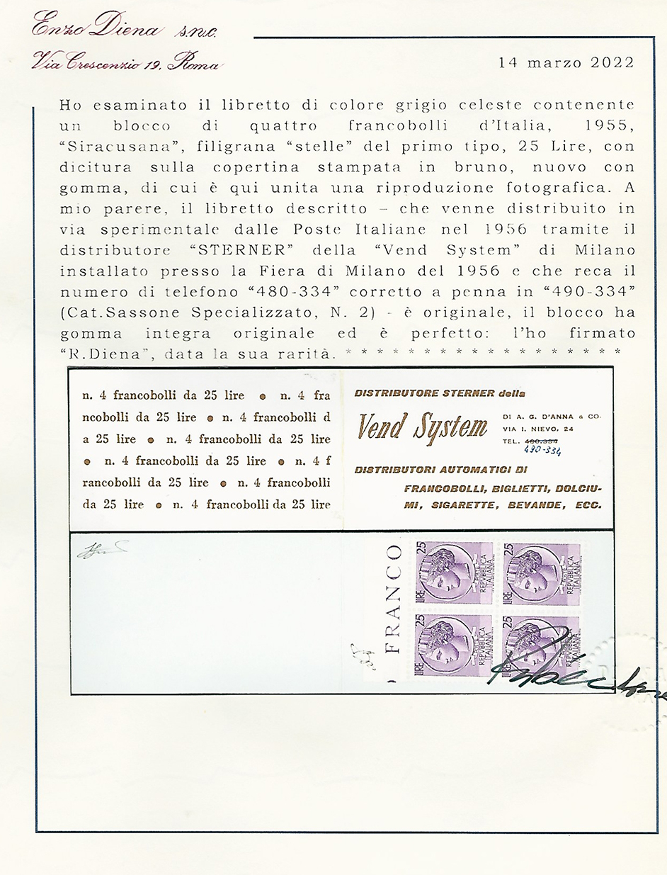 1956 - Libretto VEND SYSTEM, numero di telefono corretto a penna, cartoncino grigio celeste (5), gomma originale integra per i francobolli, perfetto. Molto raro. Cert. Ferrario e Diena. Ex coll. Faberius.