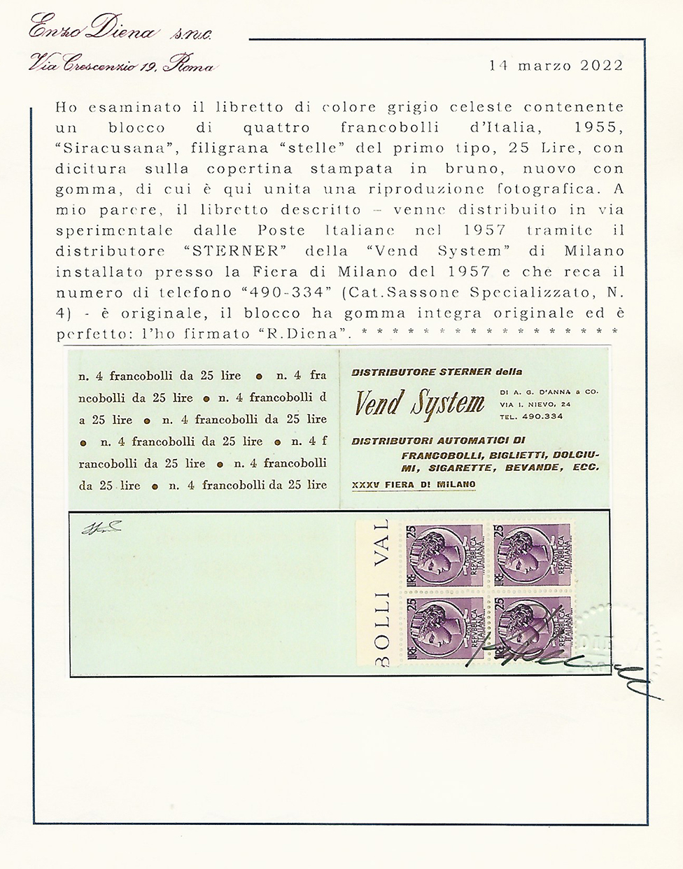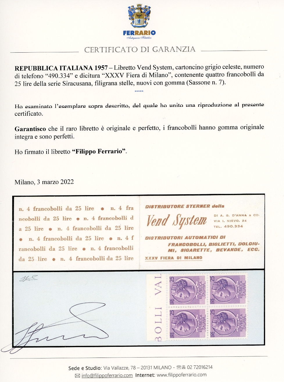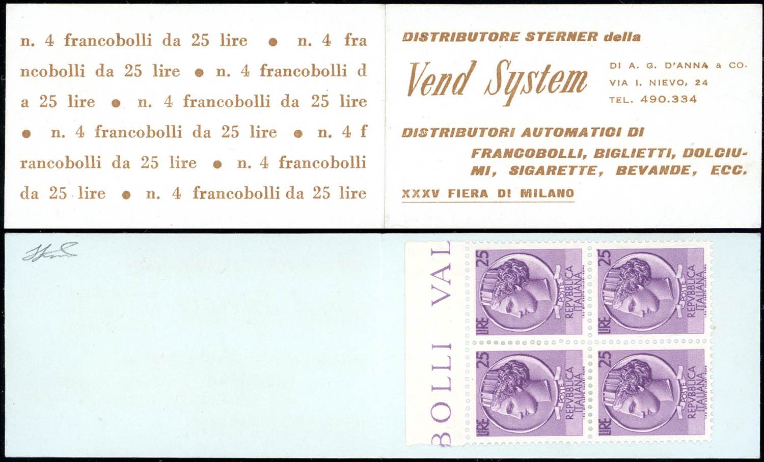 1957 - Libretto VEND SYSTEM, numero di telefono 490-334 e dicitura "XXXV Fiera di Milano", cartoncino grigio celeste (7), gomma originale integra per i francobolli, perfetto. Raro. Cert. Ferrario e Diena. Ex coll. Faberius.