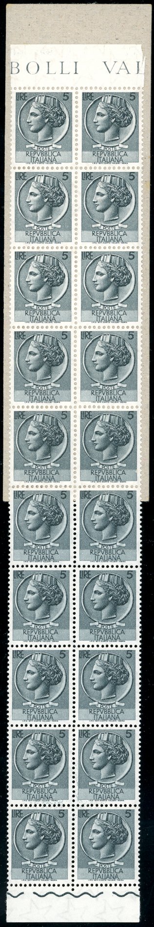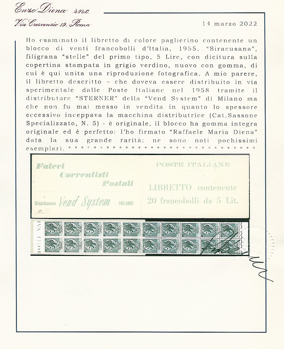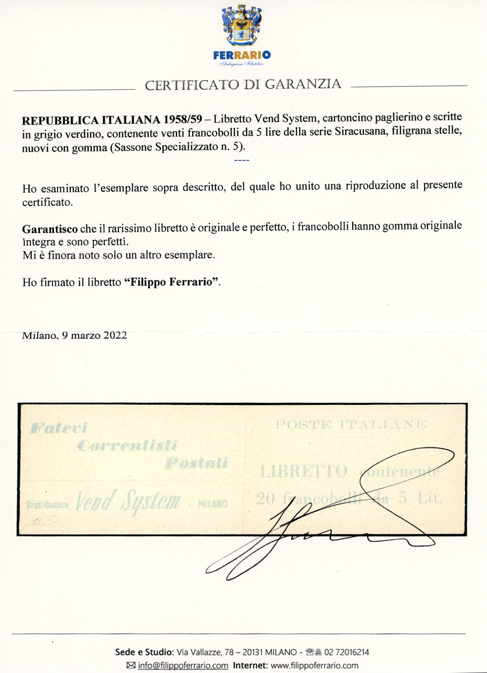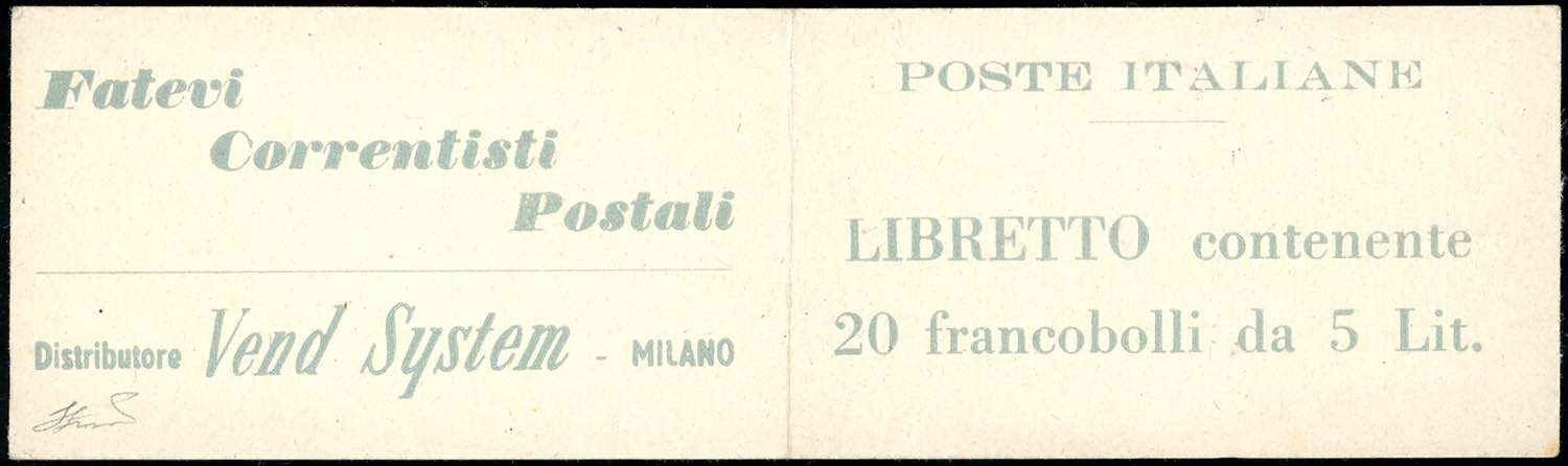 1958/59 - Libretto VEND SYSTEM, cartoncino paglierino e scritte in grigio verdino, contenente venti francobolli da 5 lire Siracusana (Sass. Spec. 5), gomma originale integra per i francobolli, perfetto. Rarissimo, solo 2 o 3 esemplari noti. Cert. Ferrario e Diena. Ex coll. Faberius.