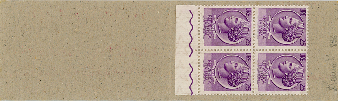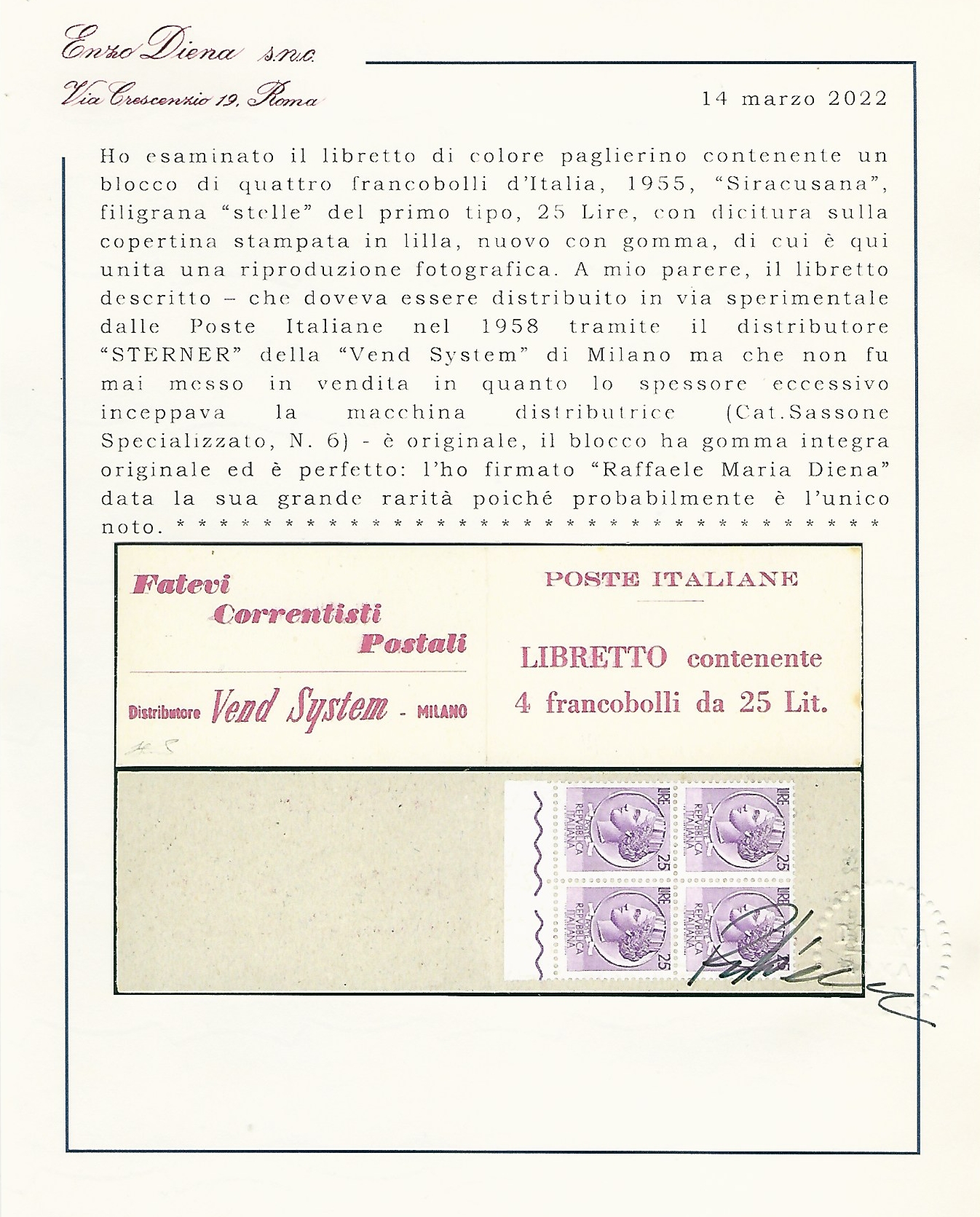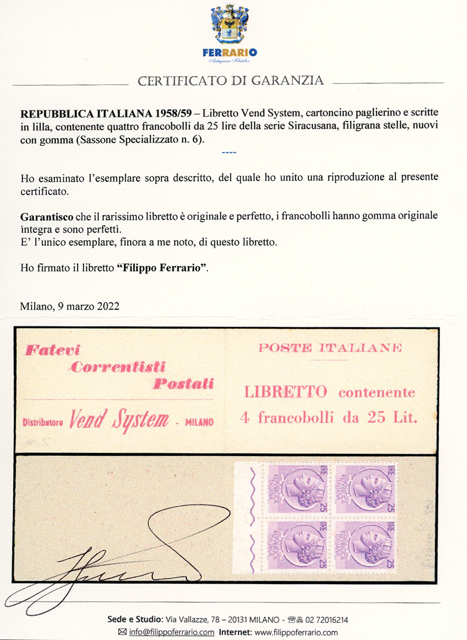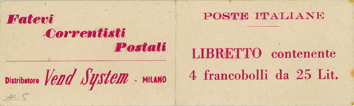 1958/59 - Libretto VEND SYSTEM, cartoncino paglierino e scritte in lilla, contenente quattro francobolli da 25 lire Siracusana (Sass. Spec. 6), gomma originale integra per i francobolli, perfetto. Esemplare leggendario per i collezionisti del settore, per la prima volta offerto in un'asta pubblica (sul Sassone Specializzato è presente solo una riproduzione in bianco e nero, proprio di questo libretto). UNICO ESEMPLARE FINORA NOTO. Cert. Ferrario e Diena. Ex coll. Faberius.