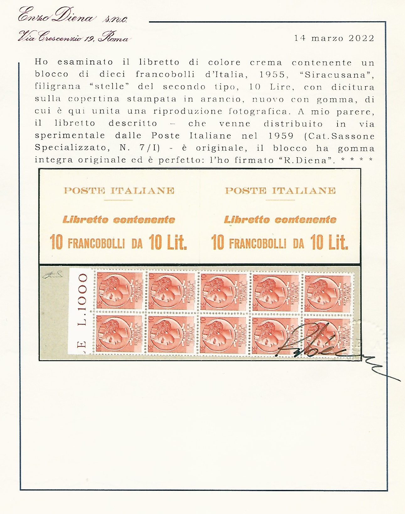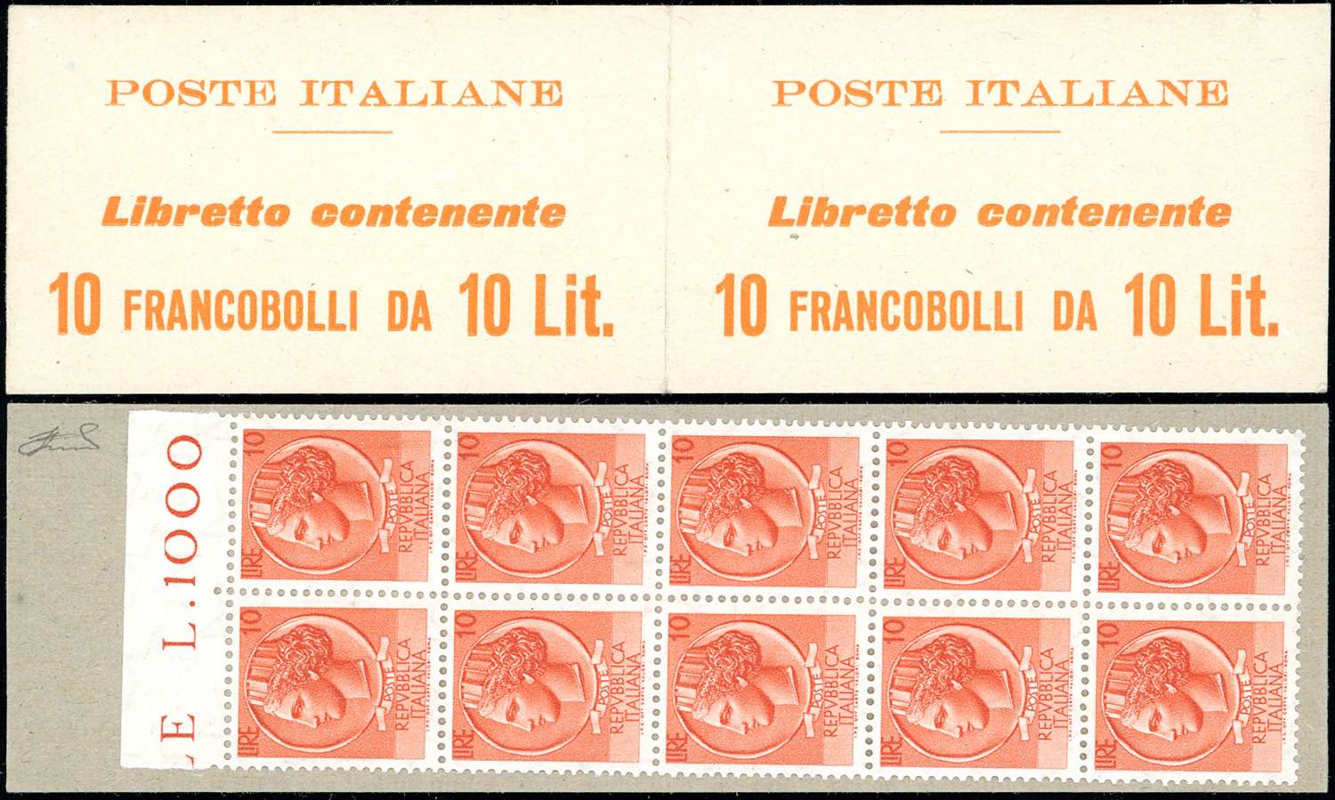 1959/60 - Libretto Poste Italiane, cartoncino crema e scritte arancioni (10, Sass. Spec. 7X), gomma originale integra per i francobolli, perfetto. Raro. Cert. Ferrario e Diena. Ex coll. Faberius.