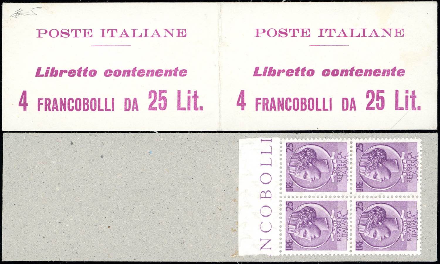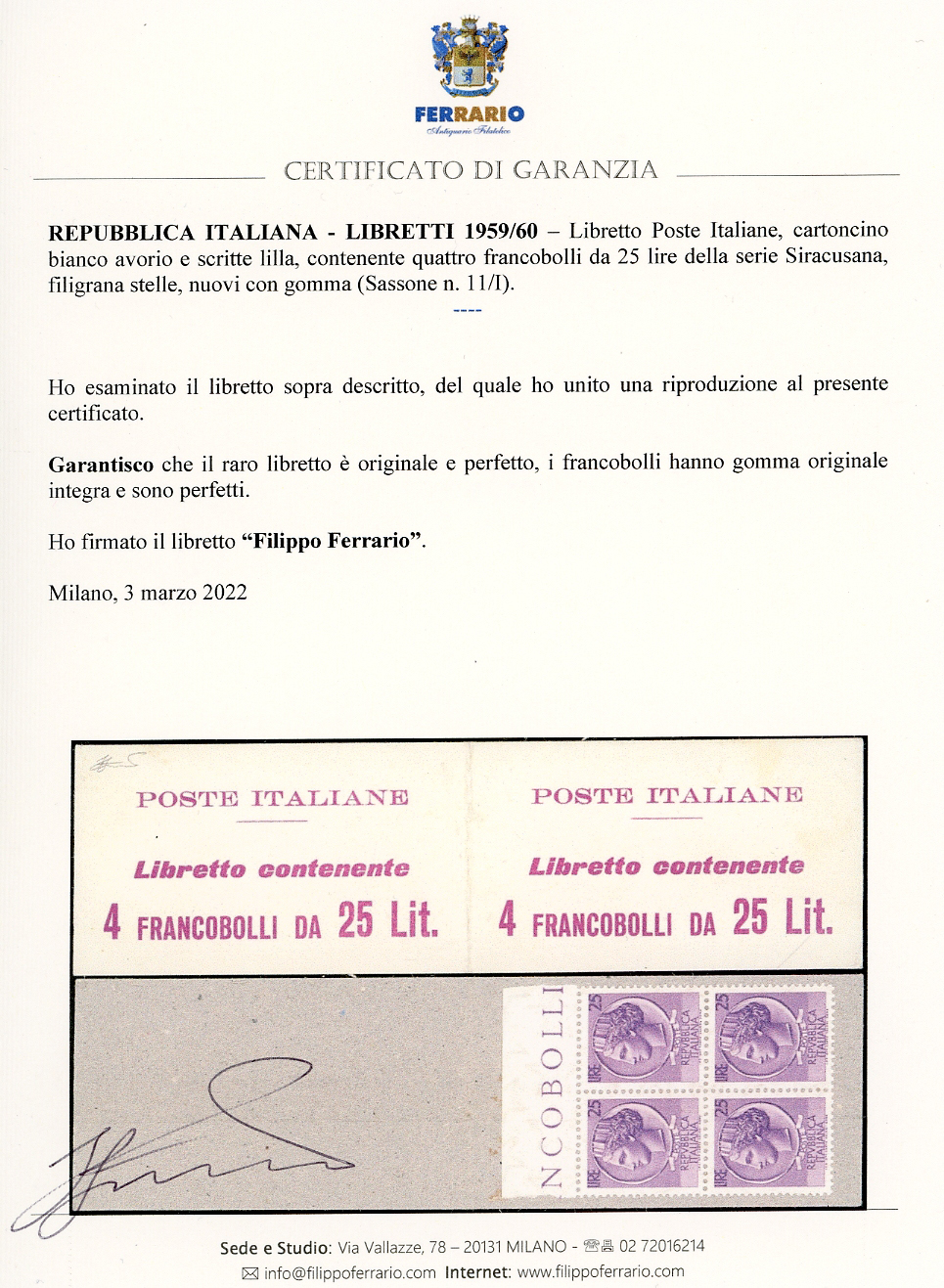 1959/60 - Libretto Poste Italiane, cartoncino bianco avorio e scritte lilla (11/I), gomma originale integra per i francobolli, perfetto. Raro. Cert. Ferrario. Ex coll. Faberius.