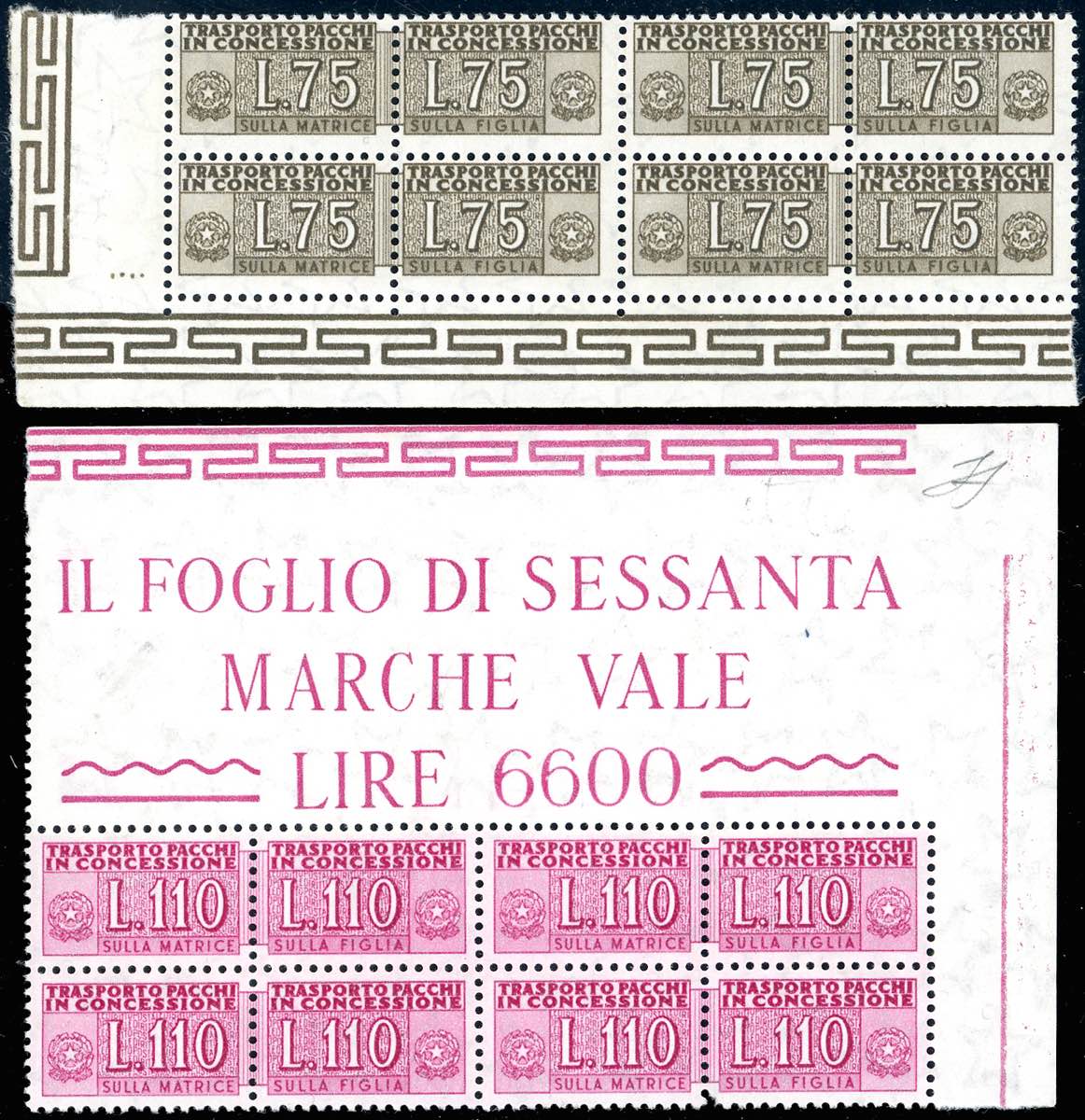 1955 - 75 lire e 110 lire, filigrana stelle (9,12), blocchi di quattro, angolo di foglio, gomma originale integra, perfetti ad eccezione di ... Read more