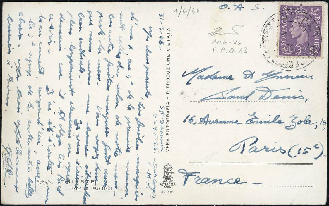 1946 - 3 p. violetto perfetto di Gran Bretagna, su cartolina raffigurante Trieste del 1/4/1946 a Parigi, annullo FIELD POST OFFICE 13 stanziato a Trieste durante l'occupazione alleata. Rara. Ferrario.