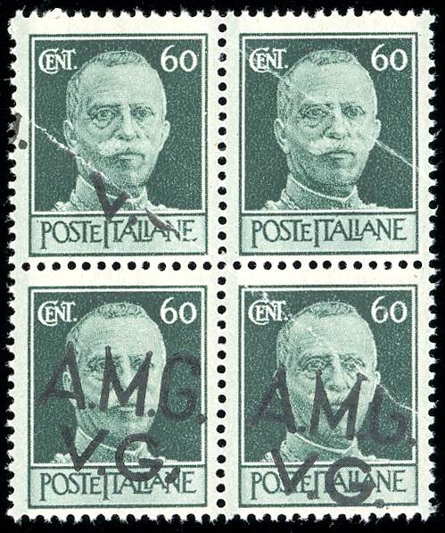 1945 - 60 cent. verde Imperiale, blocco di quattro, un esemplare senza soprastampa, un esemplare con soprastampa parziale, due con ... Read more