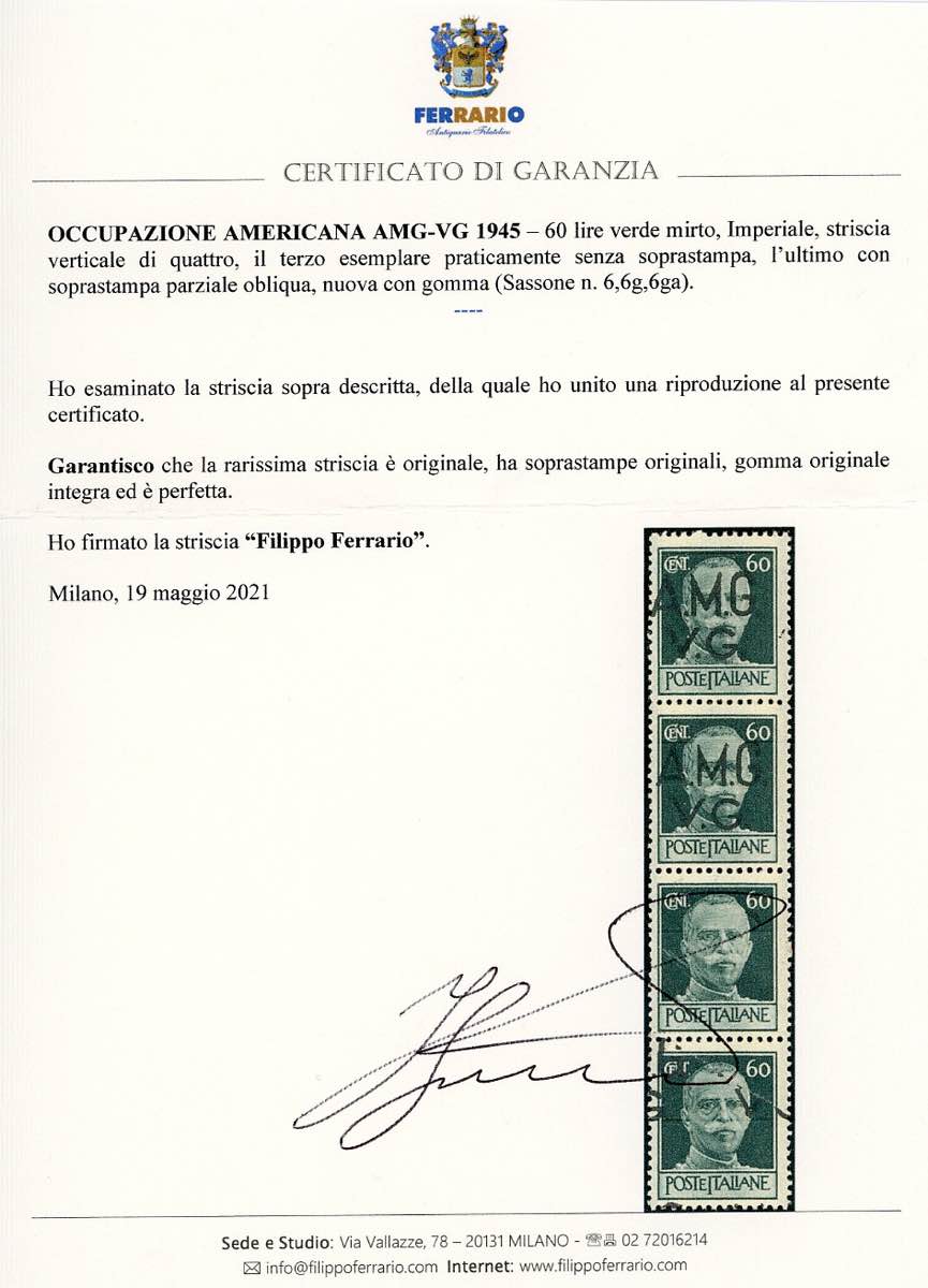 1945 - 60 cent. verde Imperiale, striscia verticale di quattro, il terzo esemplare praticamente senza soprastampa, l'ultimo con soprastampa parziale obliqua (6g,6ga), gomma integra, perfetto. Splendida varietà causata da un'anomala piegatura del foglio, INSIEME UNICO. Cert. Ferrario.