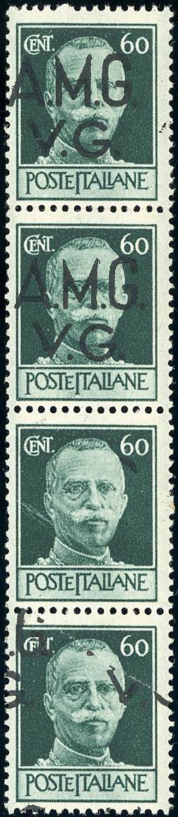 1945 - 60 cent. verde Imperiale, striscia verticale di quattro, il terzo esemplare praticamente senza soprastampa, l'ultimo con soprastampa ... Read more