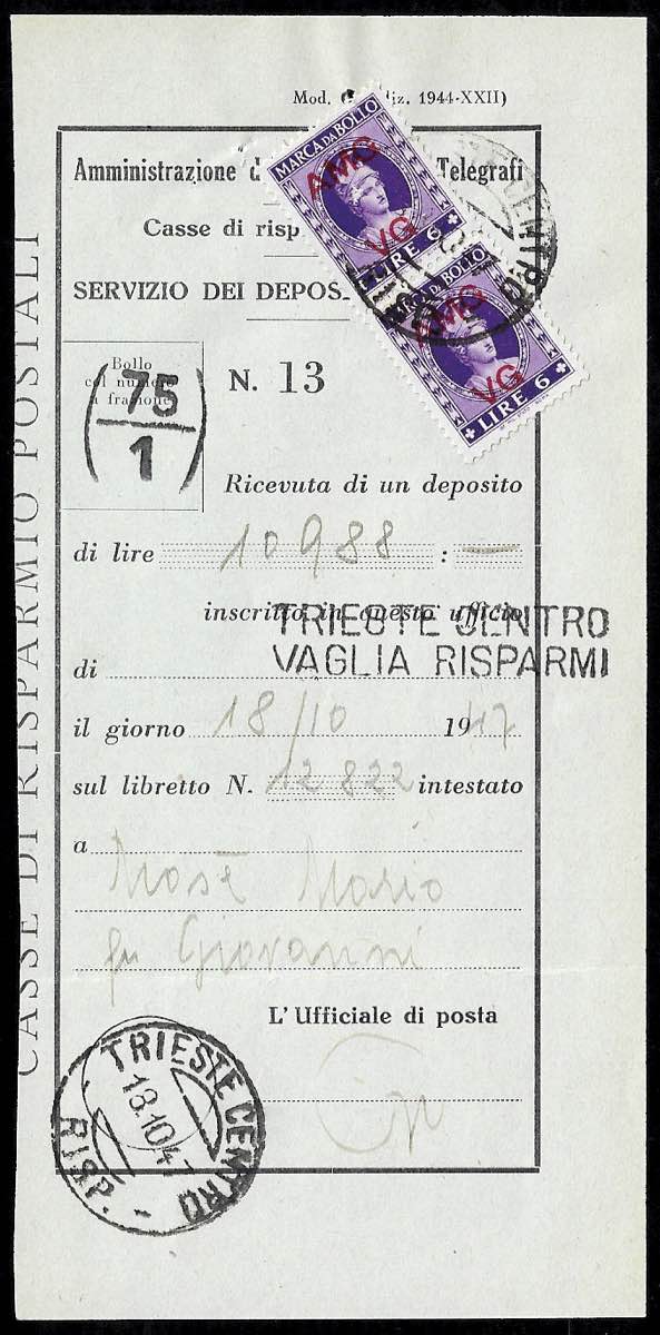 DEPOSITO GIUDIZIARIO 1947 - Ricevuta di un deposito giudiziario per il territorio libero di Trieste, affrancata con una coppia della marca da bollo da 6 lire soprastampata, annullata a Trieste 18/10/1947. Rara.