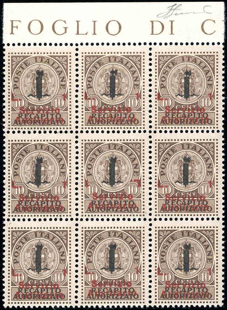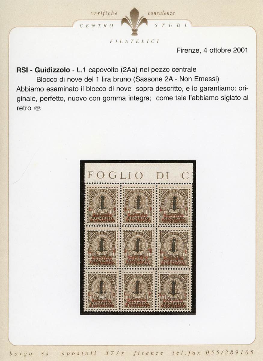 GUIDIZZOLO 1945 - 1 lira su 10 cent. bruno, recapito autorizzato, soprastampa margine di foglio superiore, con l'esemplare centrale ... Read more