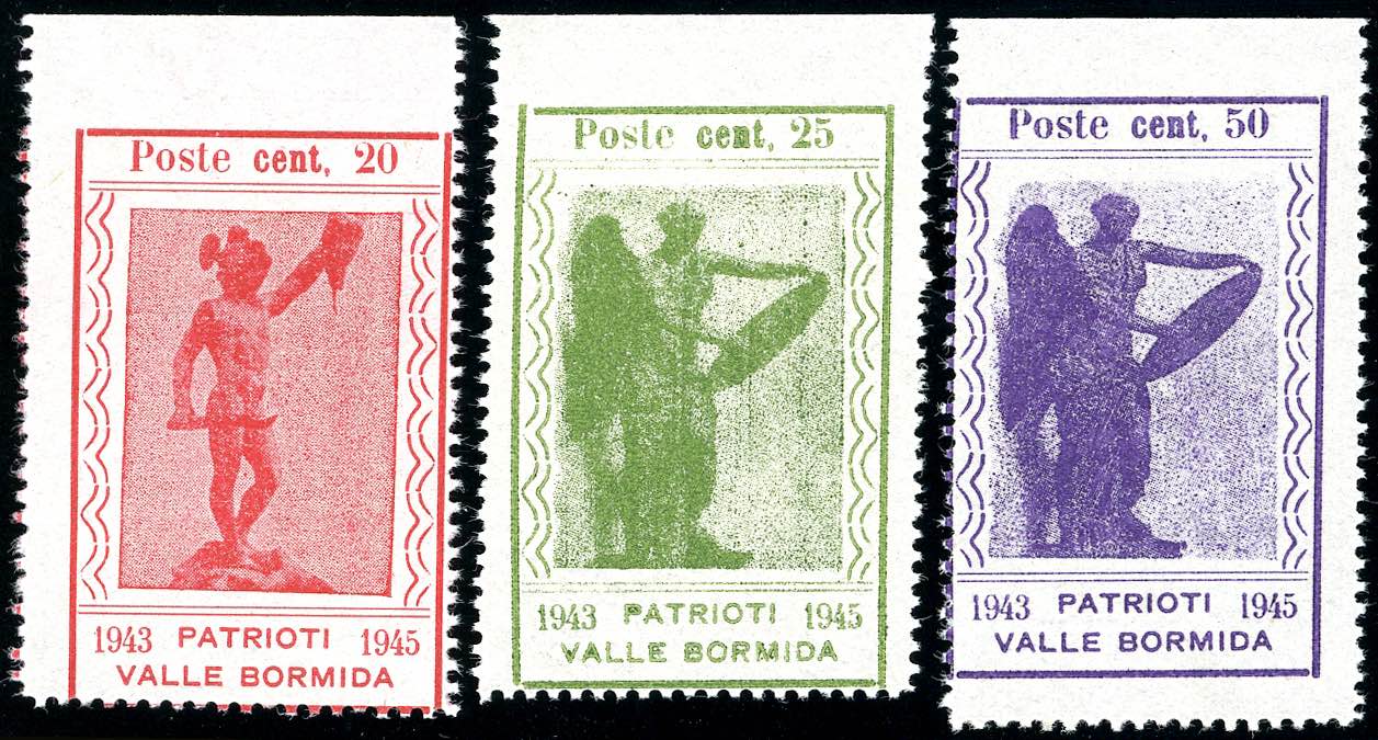 VALLE BORMIDA 1945 - 20, 25, e 50 cent. Perseo, non dentellati in alto (10d,11d,12d,), nuovi, senza gomma, perfetti. Non comuni. Ferrario.