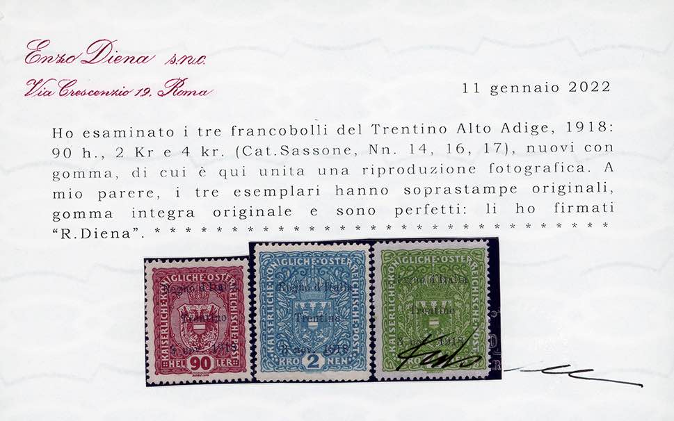 TRENTINO ALTO ADIGE 1918 - 90 h, 2 kr., 4 kr. Soprastampati (14,16,17), gomma originale integra, perfetti. Rari e di ottima qualità. G.Oliva, Caffaz, cert. Diena.