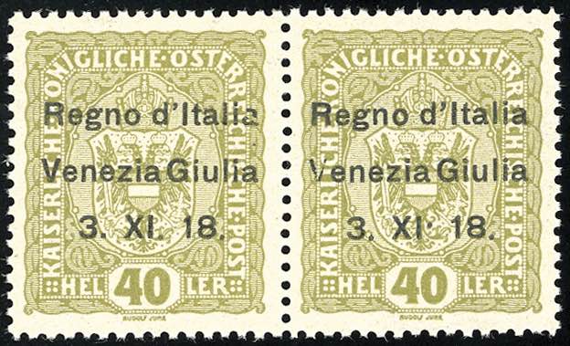 VENEZIA GIULIA 1918 - 40 h. soprastampato, coppia orizzontale, il secondo esemplare con punto in alto dopo "XI", tiratura supplementare ... Read more
