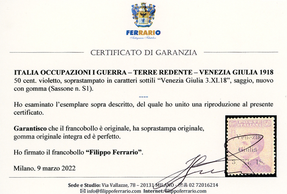 VENEZIA GIULIA 1918 - 50 cent. soprastampato in caratteri sottili, saggio (S1), gomma originale integra, perfetto. E.Diena, G.Oliva, cert. Ferrario.
