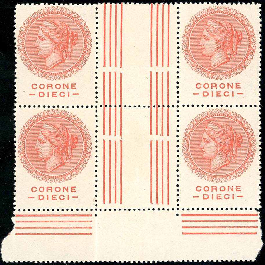 TERRE REDENTE 1919 - 10 corone Medaglione, prova di marca da bollo, blocco di quattro con interspazio di gruppo al centro, bordo di foglio, gomma originale integra, perfetta. Cert. Raybaudi.