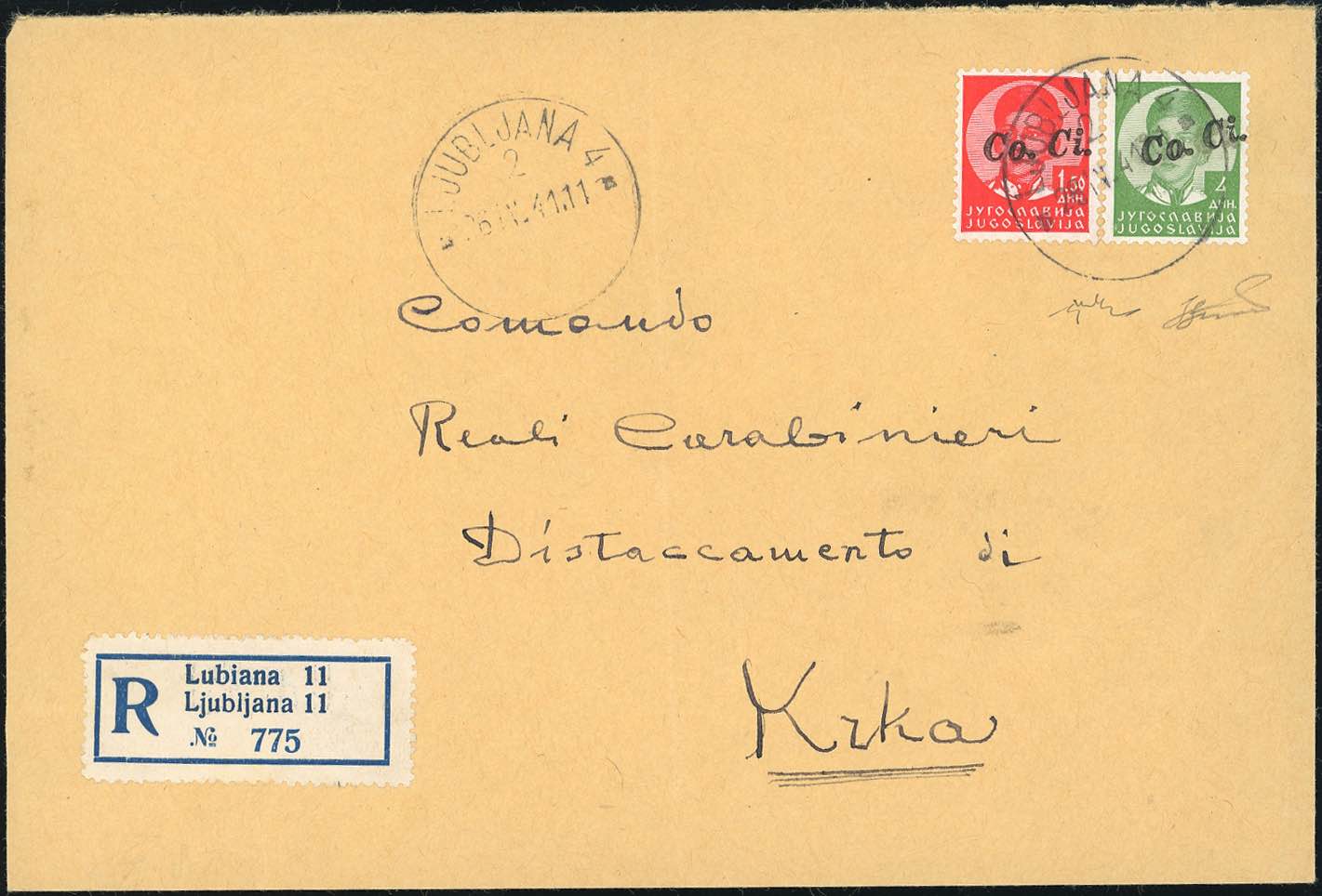 LUBIANA 1941 - 4 d. doppia soprastampa obliqua a mano "Co.Ci.", 1,50 d. soprastampa a mano, entrambi in nero (10Ab,5AA), perfetti, su busta raccomandata da Lubiana 26/4/1941, primo giorno di emissione, a KRKA, bollo d'arrivo. Varietà non catalogata, insieme UNICO! Rarità dell'emissione. Cert. Chiavarello e Ferrario.