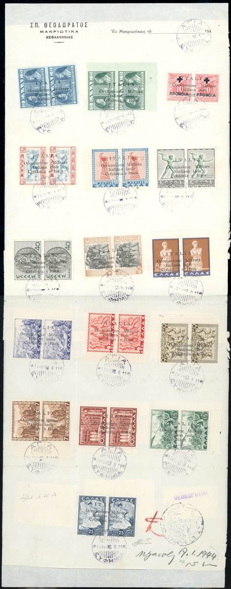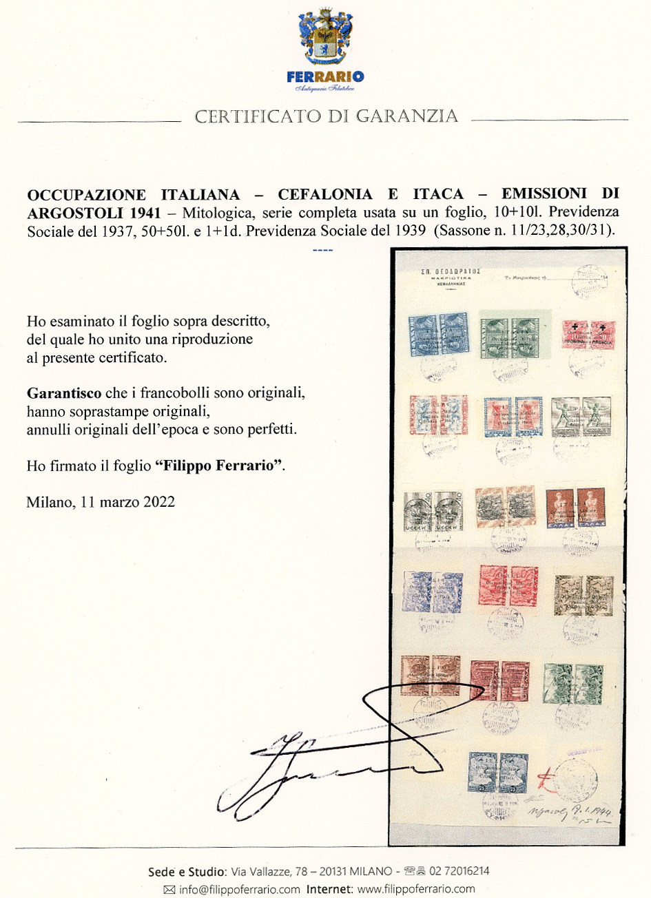 EMISISONI DI ARGOSTOLI 1941 - Mitologica, serie completa, inoltre 10 + 10 l. Previdenza Sociale del 1937, 50 + 50 l. e 1 +1 d. Previdenza Sociale del 1939 (11/23,28,30/31), perfetti, usati su un foglio con annullo originale dell'epoca. Cert. Ferrario.