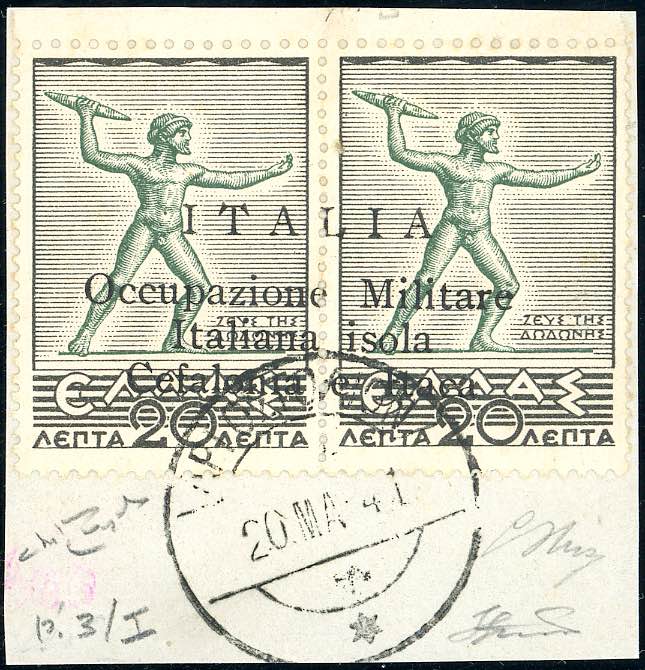 EMISSIONI DI ARGOSTOLI 1941 - 20 l. + 20 l. Mitologica, varietà "ISOLA" al posto di "ISOLE" (13r), perfetto, usato su frammento. Rarissimo. Raubaudi, G.Oliva, Ferrario.