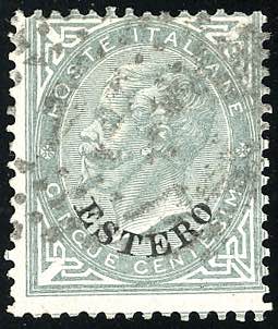 EMISSIONI GENERALI 1874 - 5 cent. soprastampato, angolo non modificato (3b), perfetto, usato. Raro! A. Diena, cert. Sorani.