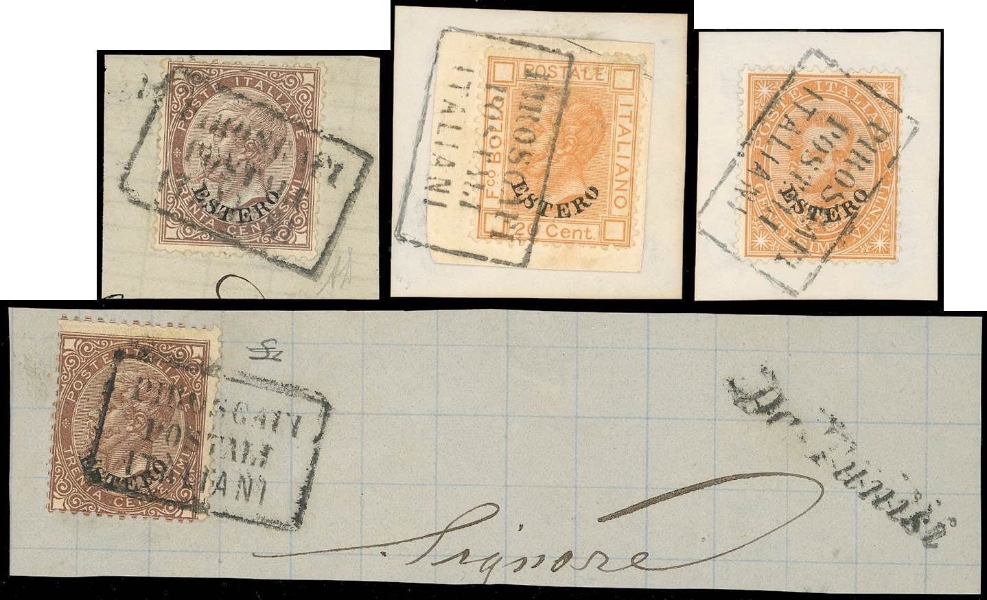 TUNISI 1874/81 - Tre esemplari De La Rue soprastampati e uno Umberto I soprastampato (6,11,14), perfetti, tutti annullati con il bollo in cartella "Piroscafi Postali Italiani", punti 9/10.