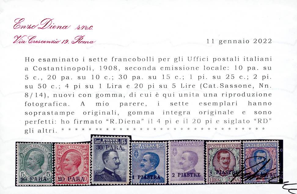 COSTANTINOPOLI 1908 - Seconda emissione locale, serie completa (8/14), gomma originale integra, perfetti. Molto freschi, ottima qualità. Cert. Diena.
