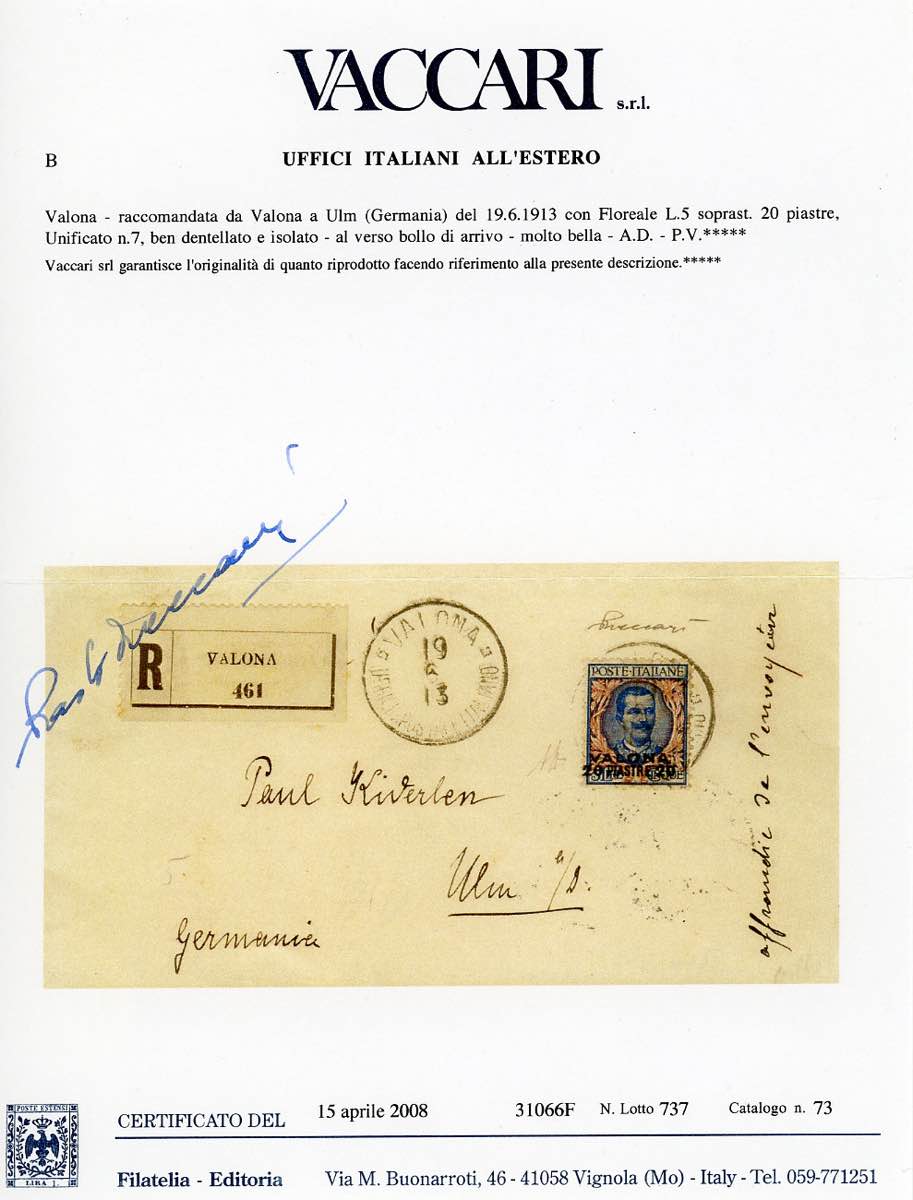 VALONA 1913 - 20 piastre su 5 lire azzurro e rosa (7), perfetto, isolato su raccomandata da Valona 19/6/1913 per la Germania. Rara. A. Diena, cert. Vaccari.