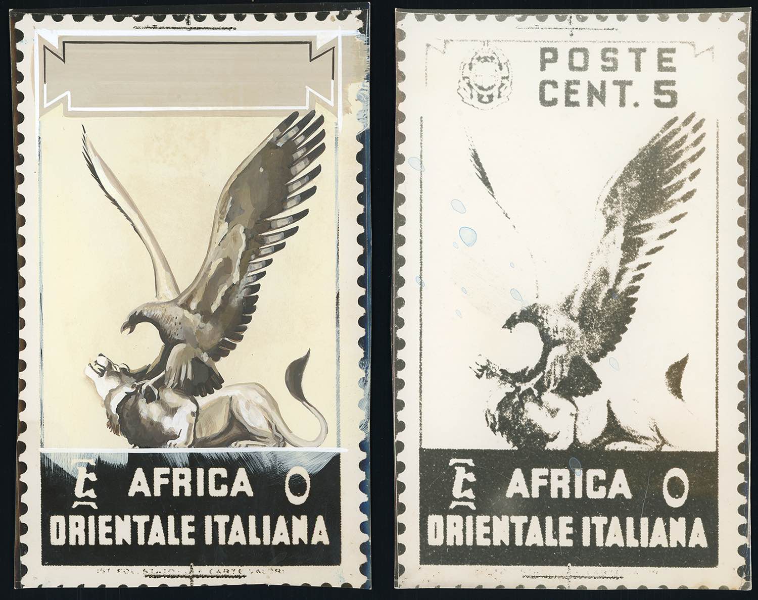 1938 - 5 cent. soggetti africani (2), saggio forografico ancora senza valore, colorato e completato a tempera da G.Latini, cm. 10 x 16. Allegata fotografia d'epoca della fotografia del francobollo definitivo. Insieme unico di grande fascino.