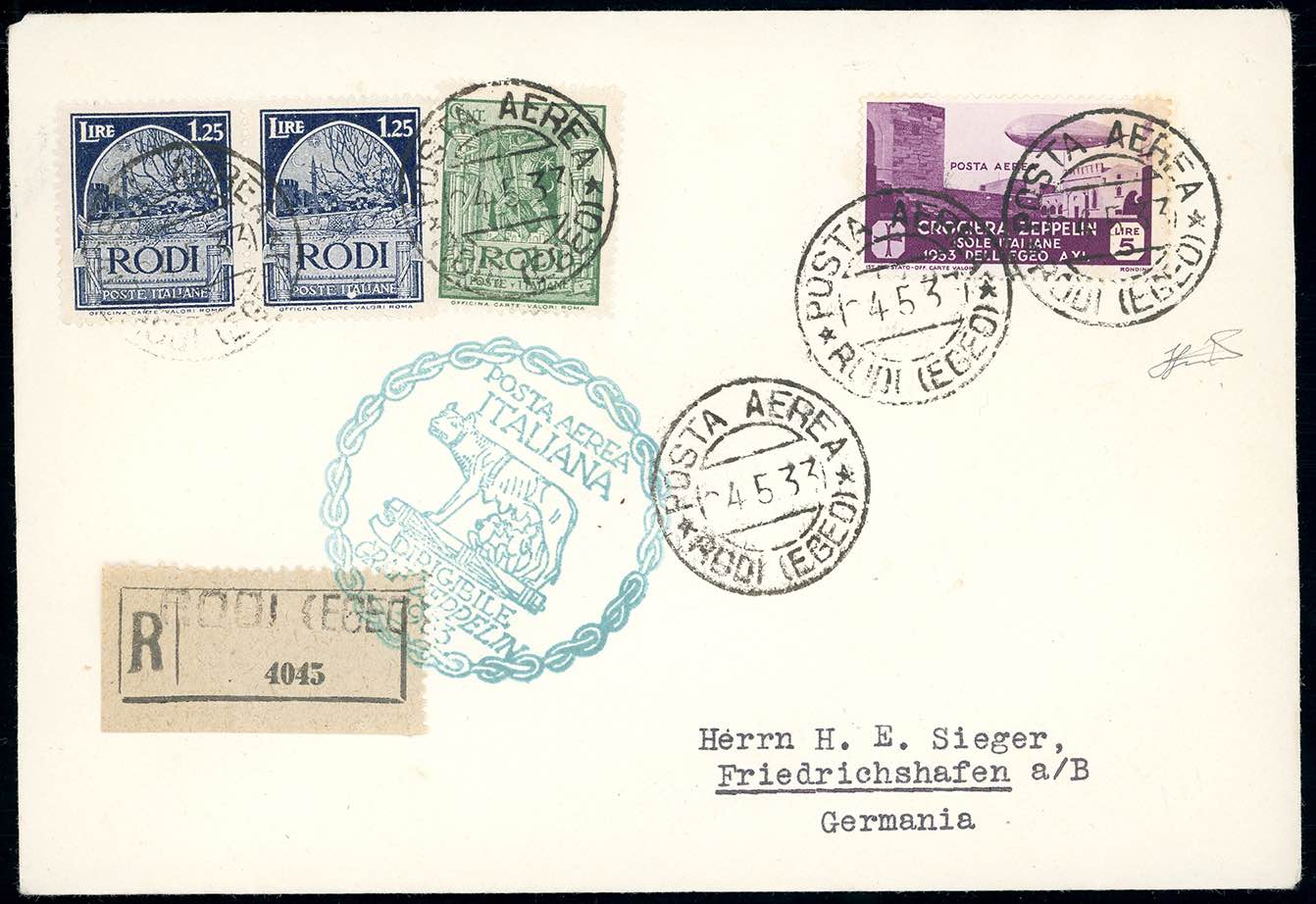 POSTA AEREA 1933 - 5 lire Zeppelin, ottimo stato, con complementari (A23,59,62), perfetti, su aerogramma raccomandato da Rodi 24/5/1933 per la Germania, bolli speciali della Crociera Zeppelin sul fronte e al verso. Ferrario.