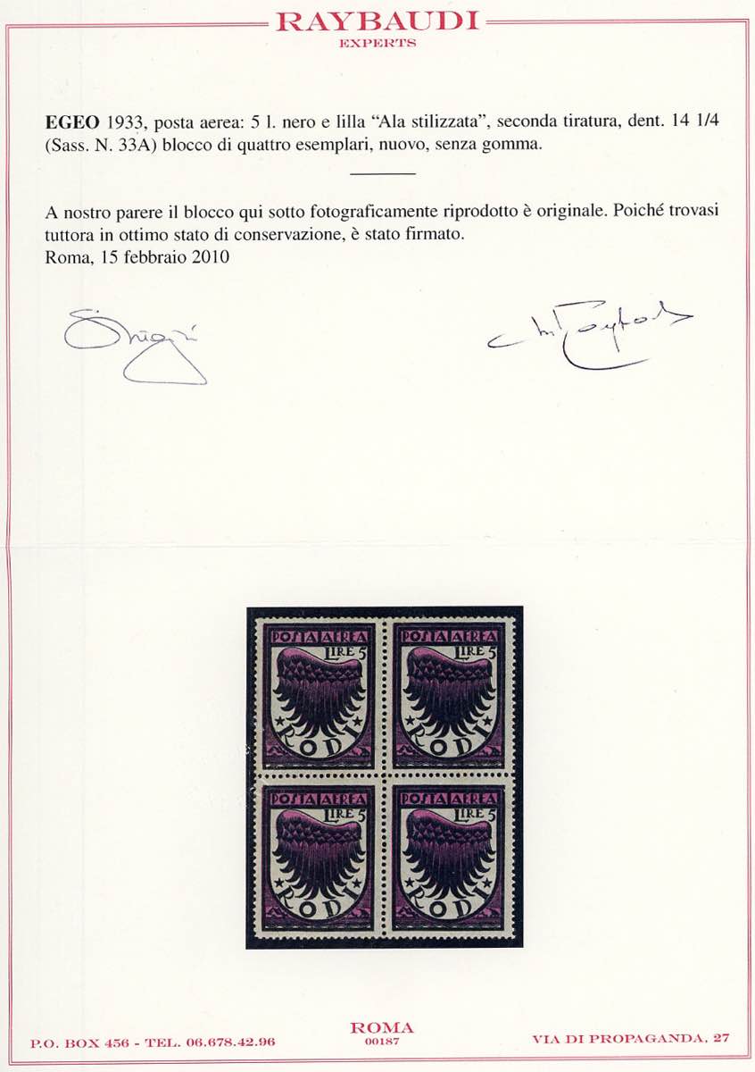 POSTA AEREA 1933 - 5 lire Ala stlizzata, II tiratura (33A), blocco di quattro, nuovo senza gomma, perfetto. Raro. Cert. Raybaudi ... Read more