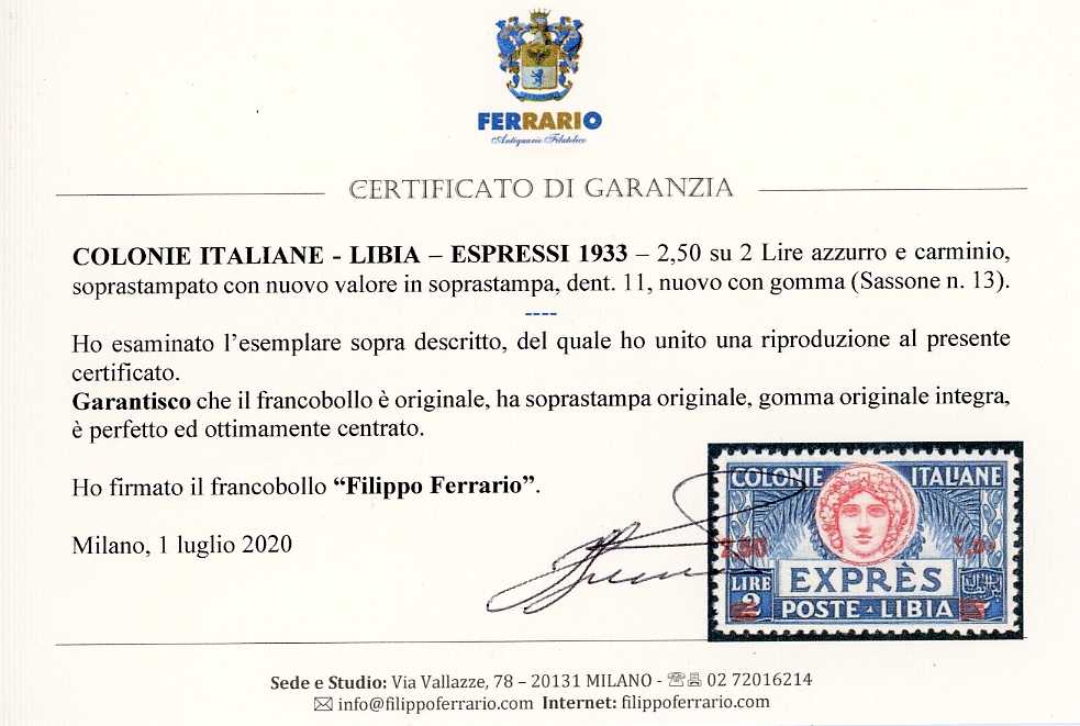 ESPRESSI 1933 - 2,50 su 2 lire azzurro e carminio, soprastampato (13), nuovo, gomma originale integra, perfetto e ottimamente centrato. Bellissimo! Cert. Ferrario.