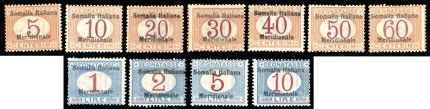 SEGNATASSE 1906 - Soprastampati "Somalia Italiana Meridionale", serie completa (1/11), gomma originale, invisibile traccia di linguella, perfetti. Alti valori Fiecchi.