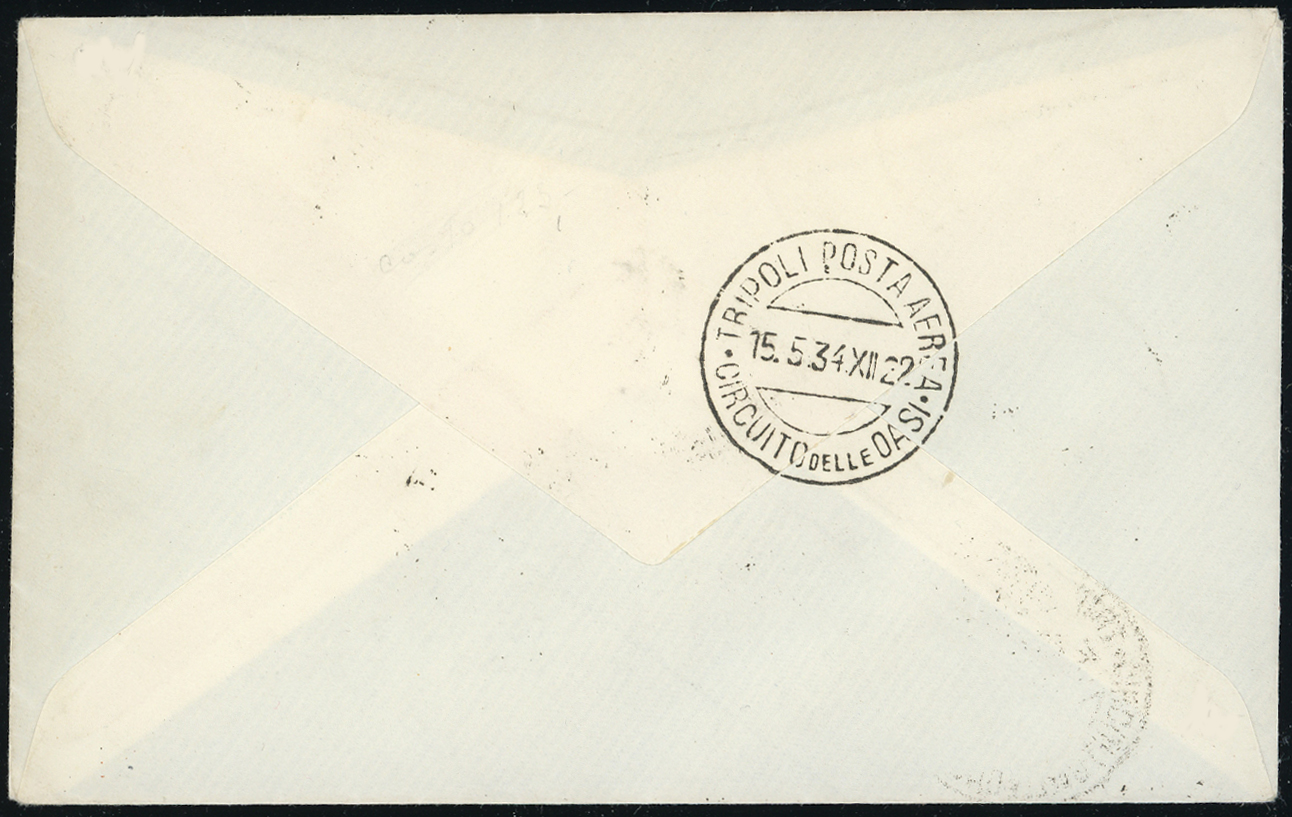 POSTA AEREA 1934 - Circuito delle Oasi, serie completa (34/40), perfetti, su busta con annullo speciale da Tripoli 14/5/1934, per città, bollo d'arrivo al verso 15/5/1934. Rara! Cert. Ferrario.