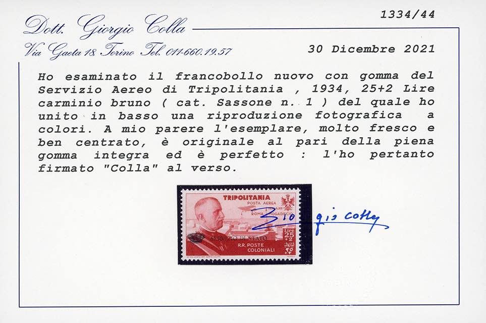 SERVIZIO AEREO 1934 - 25 + 2 lire Coroncina (1), gomma originale integra, perfetto. Bellissimo. Cert. Colla.