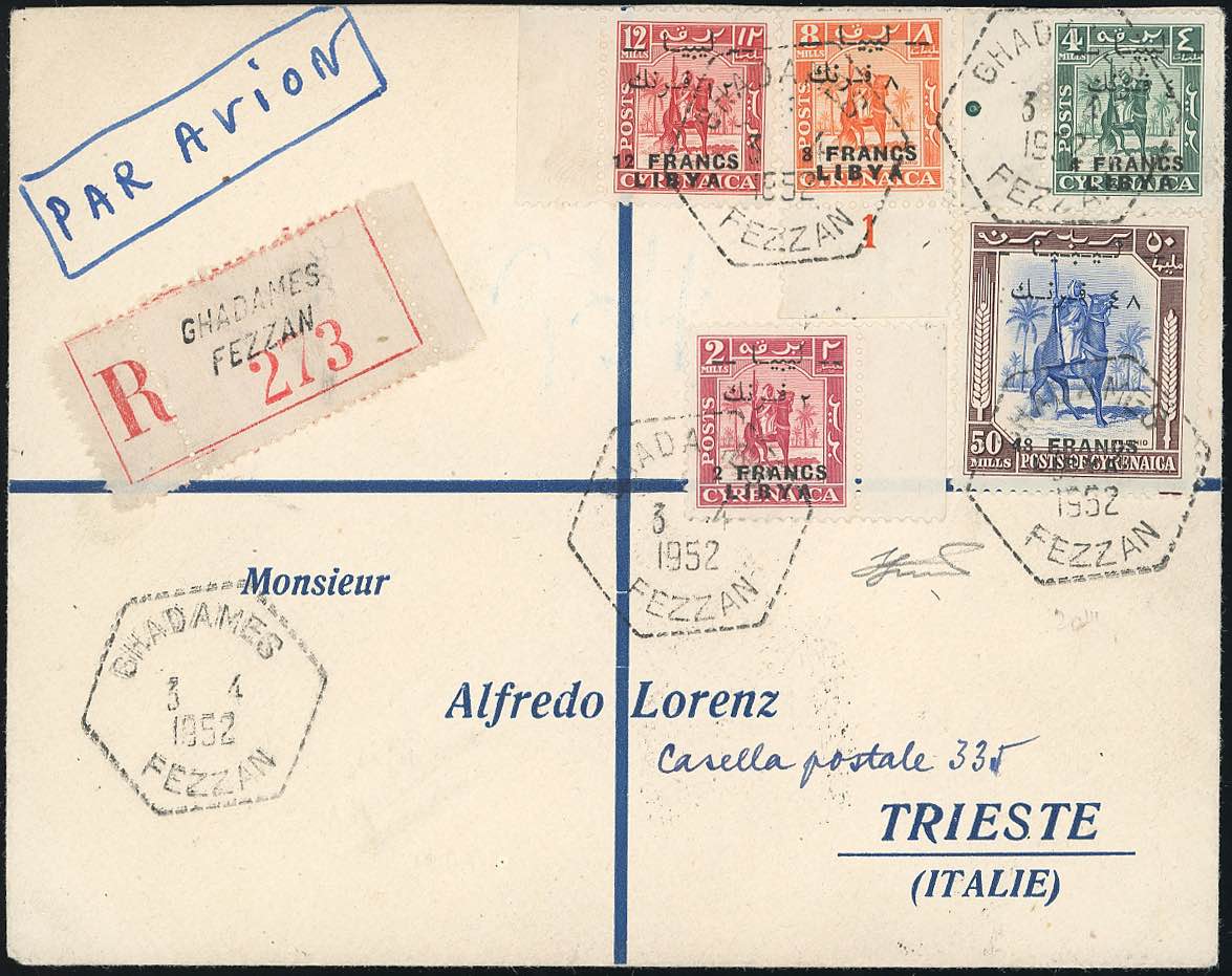 LIBIA REGNO INDIPENDENTE 1952 - Emissione per il Fezzan, 2 f. su 2 m., 4 f. su 4 m., 8 f. su 8 m., 10 f. su 10 m., 48 f. su 50 m. (14/17,20), perfetti, su aerogramma raccomandato da Ghadames 3/4/1952 per Trieste, bollo di arrivo al verso. Grande rarità dell'emissione. Cert. Ferrario.