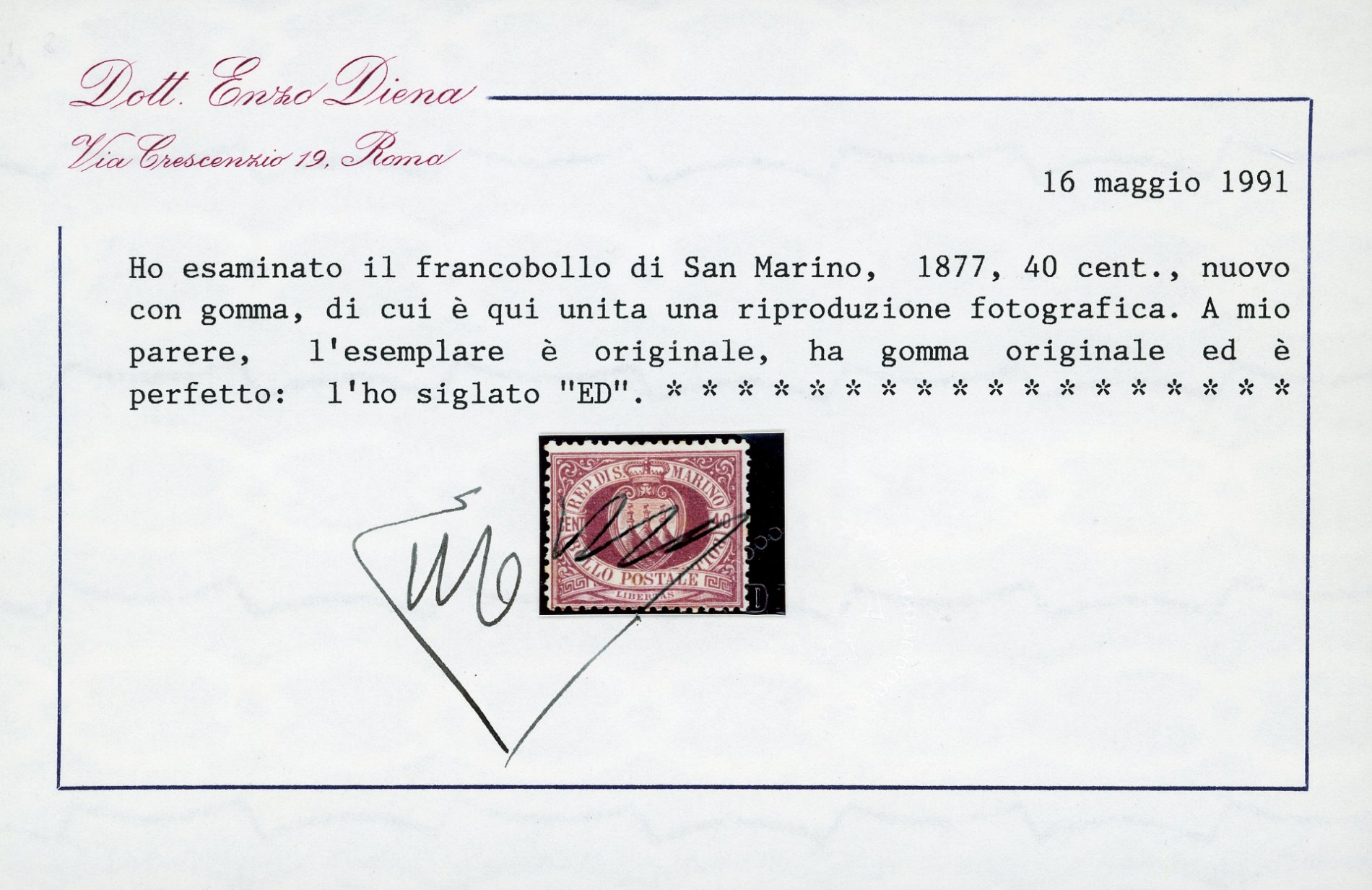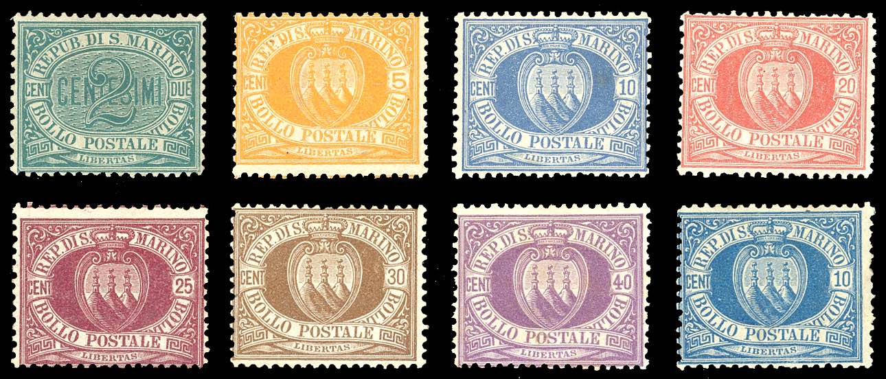 1877/90 - Prima emissione, serie completa di otto valori (1/7+3A), nuovi, gomma originale, perfetti, discreta centratura. Alti valori cert. Diena e Ferrario.