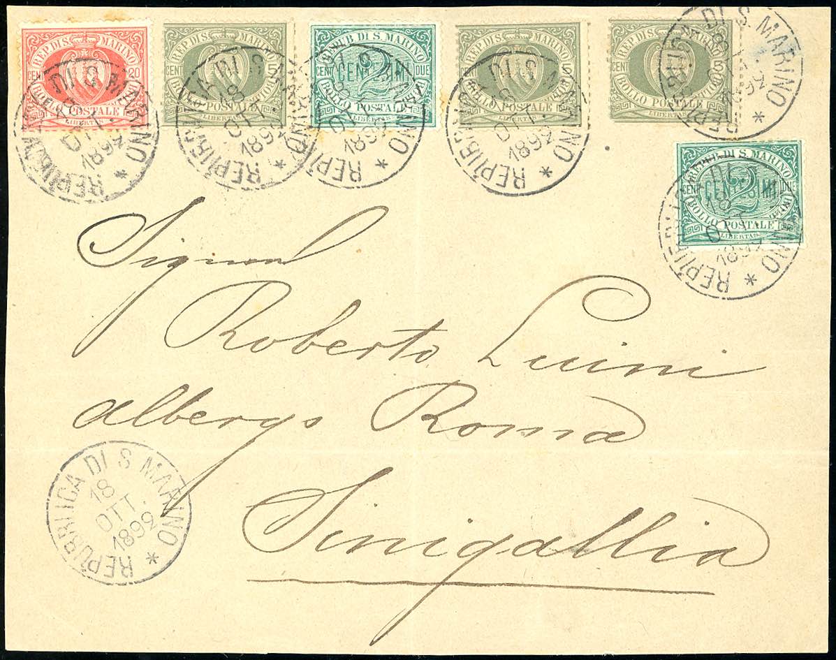1892 - 2 cent. Cifra, due esemplari, 5 cent., tre esemplari, 20 cent. Stemma (1,4,13), perfetti, su frontespizio di lettera da San Marino 18/10/1892 a Senigallia.